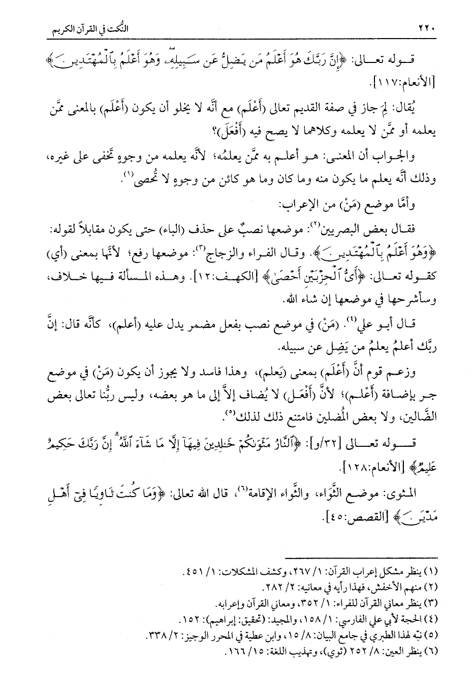 وزعم قوم أن (أعلم) بمعنى (يعلم) ، وهذا فاسد ولا يجوز أ، يكون (من) في موضع جر بإضافة (أعلم) ؛ لأن (أفعل) لا يضاف إلا إلى ما هو بعضه، وليس ربنا تعالى بعض الضالين، ولا بعض المضلين فامتنع ذلك لذلك.