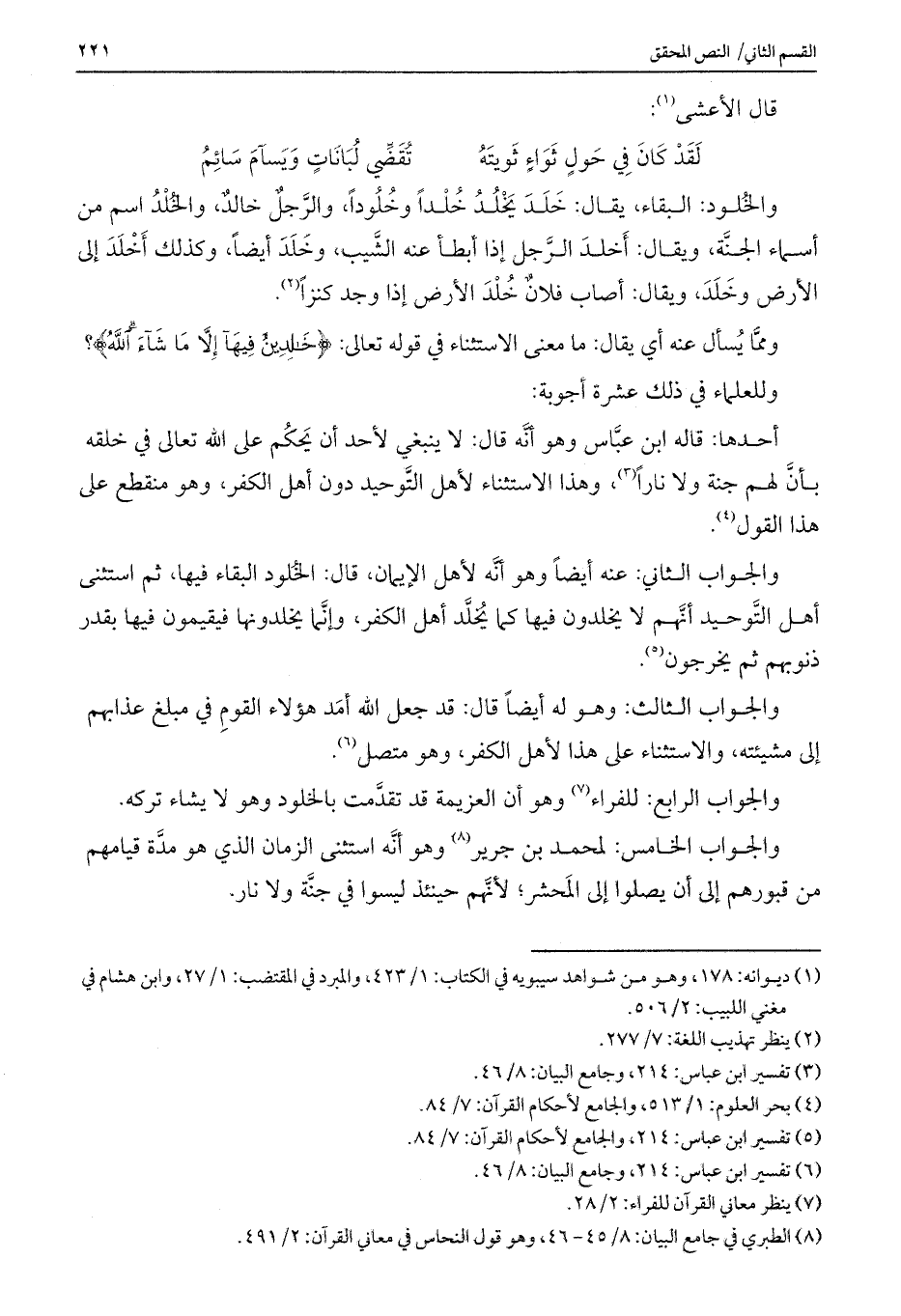 والجواب الثاني: عنه أيضاً وهو أنه لأهل الإيمان، قال: الخلود البقاء فيها، ثم استثنى أهل التوحيد أنهم لا يخلدون فيها كما يخلد أهل الكفر، وإنما يخلدونها فيقمون فيها بقدر ذنوبهم ثم يخرجون.
