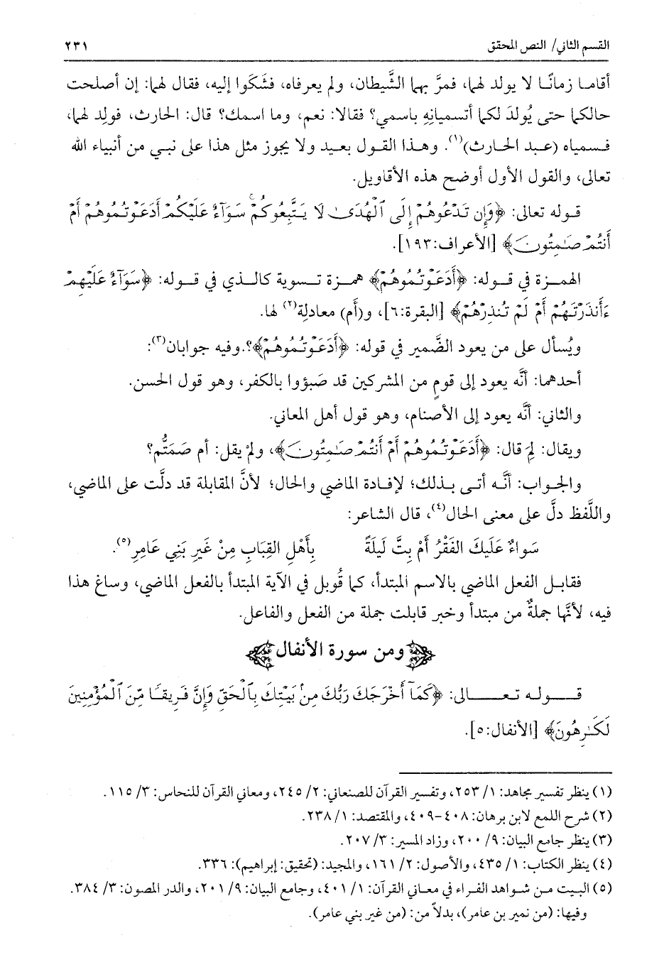 أقاما زماناً لا يولد لهما، فمر بهما الشيطان، ولم يعرفاه، فشكوا إليه، فقال لهما: إن أصلحت حالكما حتى يولد لكما أتسميانه باسمي؟ فقالا: نعم، وما اسمك؟ قال: الحارث، فولد لهما، فسمياه (عبد الحارث) . وهذا القول بعيد ولا يجوز مثل هذا على نبي من أنبياء الله تعالى، والقول الأول أوضح هذه الأقاويل.