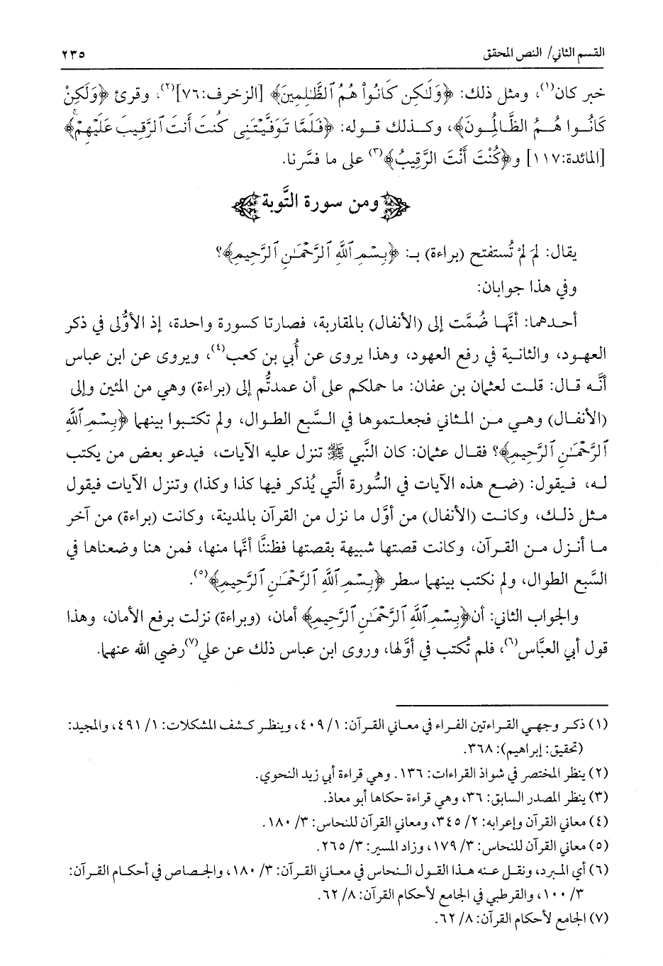 والجواب الثاني: أن {بِسْمِ اللَّهِ الرَّحْمَنِ الرَّحِيمِ} أمان، (وبراءة) نزلت برفع الأمان، وهذا قول أبي العباس، فلم تكتب في أولها، وروى ابن عباس ذلك عن علي رضي الله عنهما.