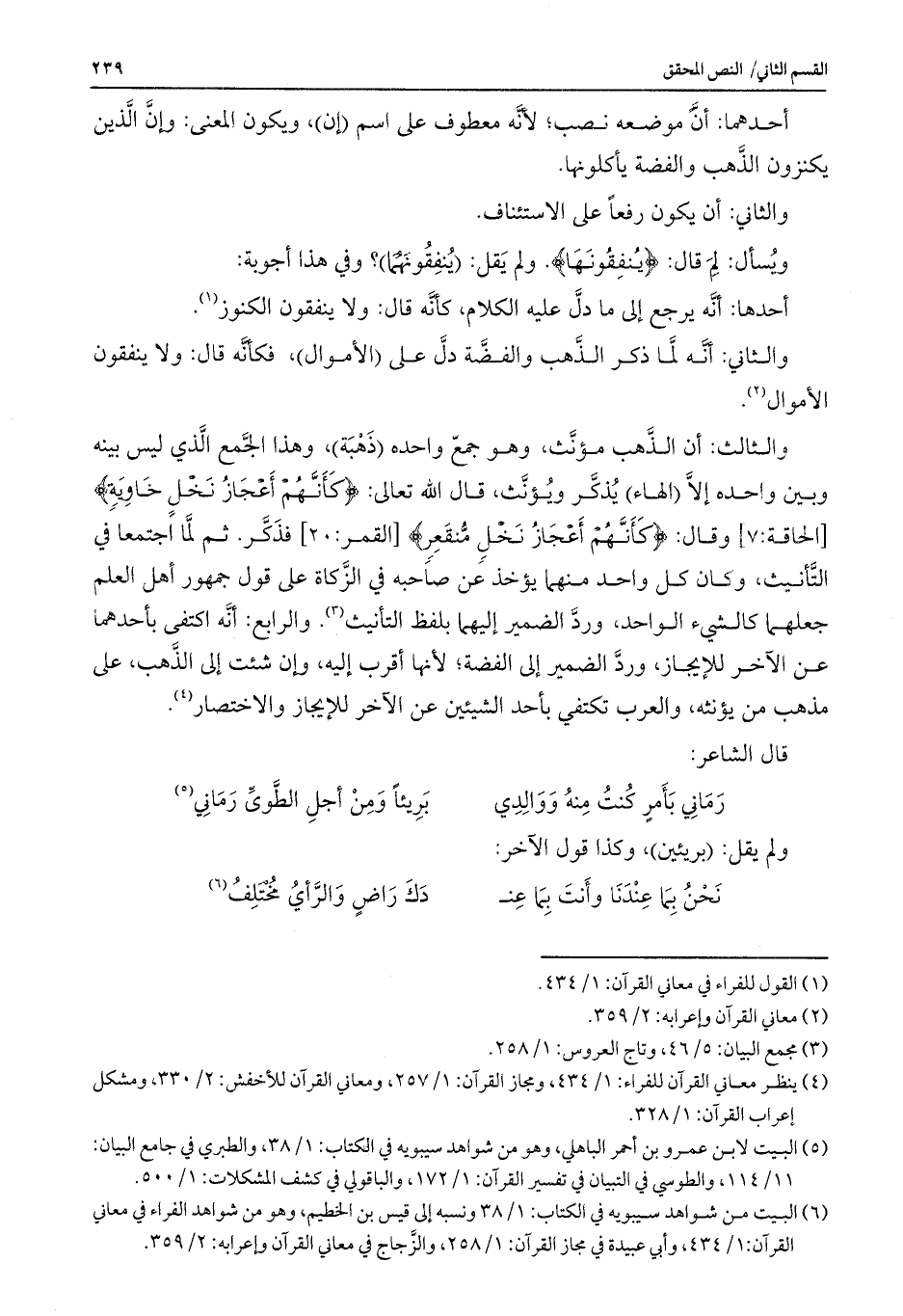 والثالث: أن الذهب مؤنث، وهو جمع واحده (ذَهْبة) ، وهذا الجمع الذي ليس بينه وبين واحده إلا (الهاء) يذكر ويؤنث، قال الله تعالى: {كَأَنَّهُمْ أَعْجَازُ نَخْلٍ خَاوِيَةٍ} [الحاقة: 7] وقال: {كَأَنَّهُمْ أَعْجَازُ نَخْلٍ مُنْقَعِرٍ} [القمر: 20] فذكر. ثم لما اجتمعا في التأنيث، وكان كل واحد منهما يؤخذ عن صاحبه في الزكاه على قول جمهور أهل العلم جعلهما كالشيء الواحد، ورد الضمير إليهما بلفظ التأنيث. والرابع: أنه اكتفى بأحدهما عن الآخر للإيجاز، ورد الضمير إلى الفضة؛ لأنها أقرب إليه، وإن شئت إلى الذهب، على مذهب من يؤنثه، والعرب تكتفي بأحد الشيئين عن الآخر للإيجاز والاختصار.