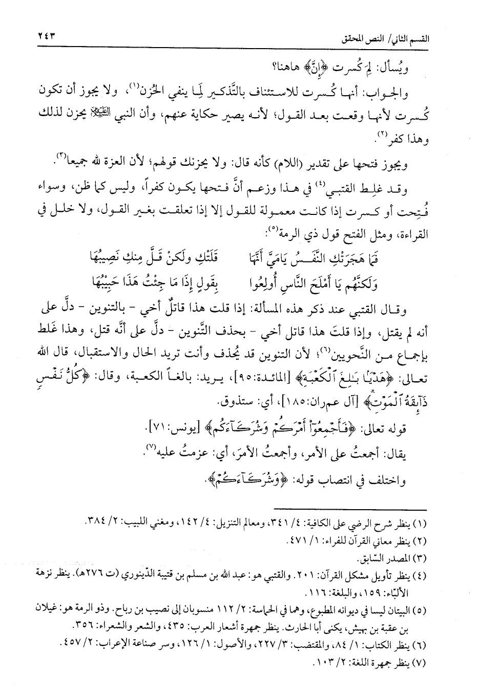 وقد غلط القتبي في هذا وزعم أن فتحها يكون كفراً، وليس كما ظن، وسواء فتحت أو كسرت إذا كانت معمولة للقول إلا إذا تعلقت بغير القول، ولا خلل في القراءة، ومثل الفتح قول ذي الرمة: