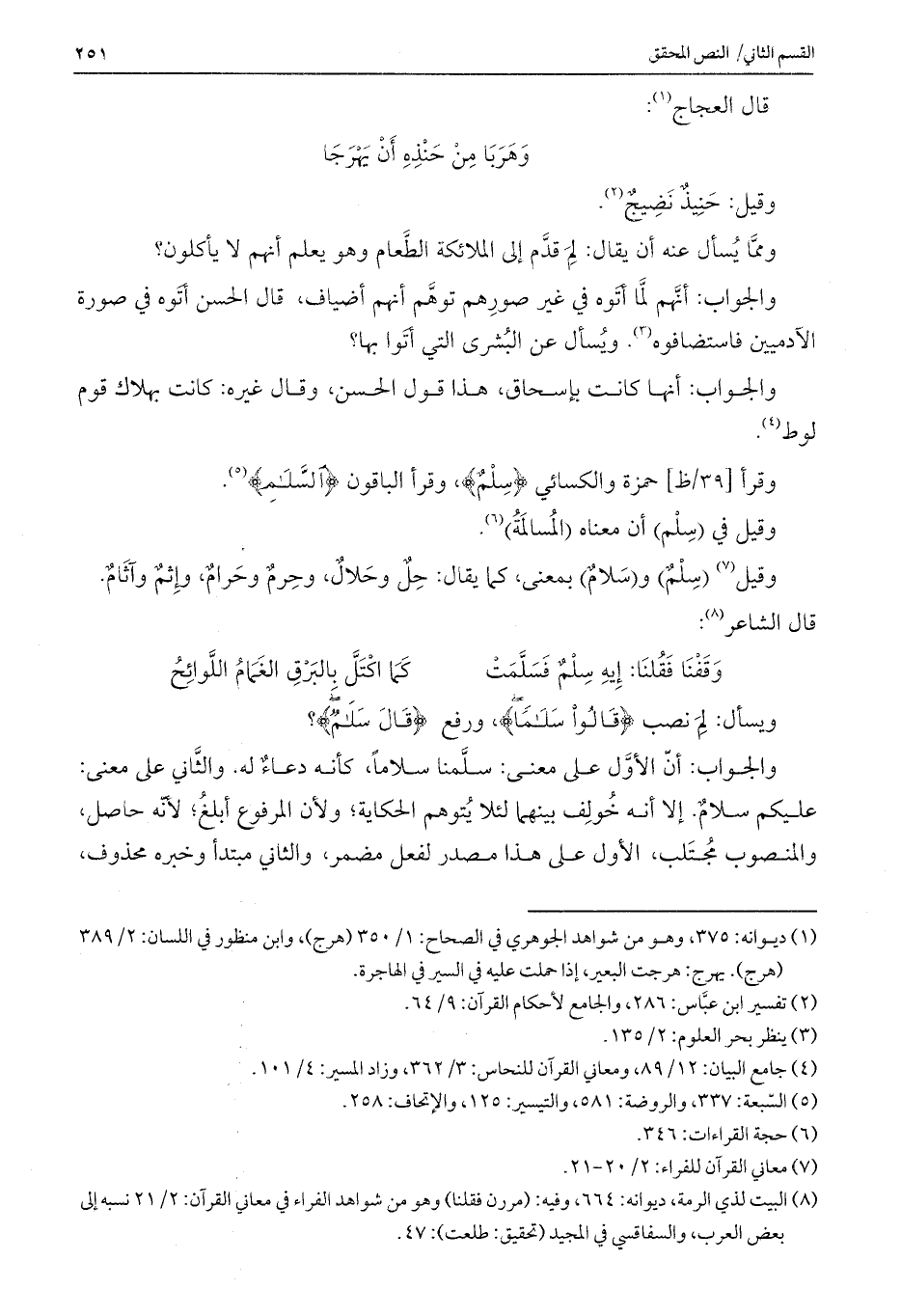 والجواب: أن الأول على معنى: سلمنا سلاماً، كأنه دعاء له. والثاني على معنى: عليكم سلامٌ. إلا أنه خولف بينهما لئلا يتوهم الحكاية؛ ولأن المرفوع أبلغ؛ لأنه حاصل، والمنصوب مجتلب، الأول على هذا مصدر لفعل مضمر، والثاني مبتدأ وخبره محذوف،