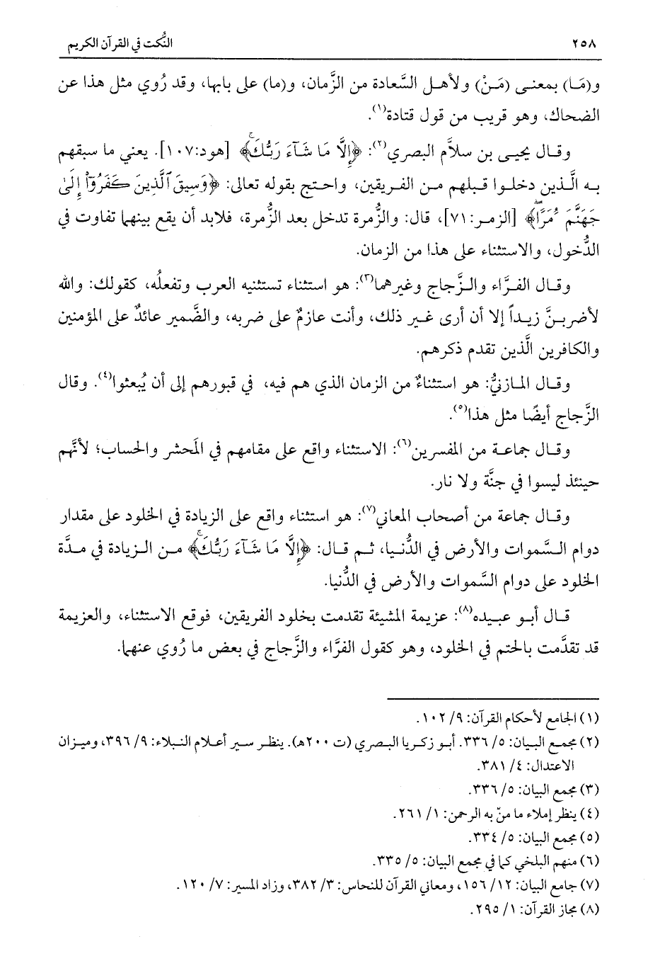 وقال يحيي بن سلام البصري: {إِلَّا مَا شَاءَ رَبُّكَ} [هود: 107] . يعني ما سبقهم به الذين دخلوا قبلهم من الفريقين، واحتج بقوله تعالى: {وَسِيقَ الَّذِينَ كَفَرُوا إِلَى جَهَنَّمَ زُمَرًا} [الزمر: 71] ، قال: والزمرة تدخل بعد الزمرة، فلابد أن يقع بينهما تفاوت في الدخول، والاستثناء على هذا من الزمان.