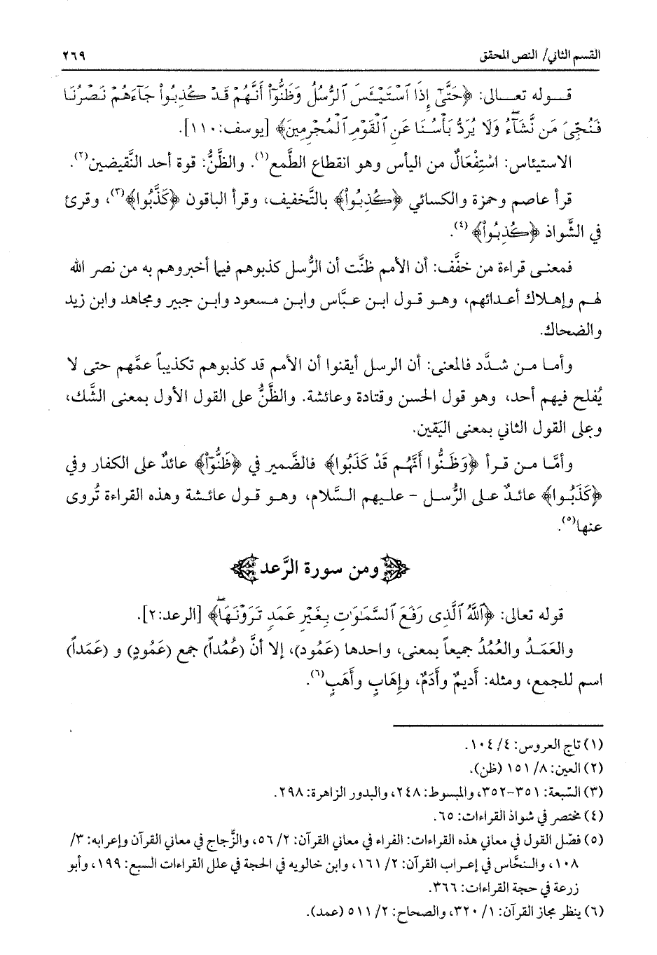 وأما من شدد فالمعنى: أن الرسل أيقنوا أن الأمم قد كذبوهم تكذيباً عمَّهم حتى لا يفلح فيهم أحد، وهو قول الحسن وقتادة وعائشة. والظن على القول الأول بمعنى الشك، وعلى القول الثاني بمعنى اليقين.