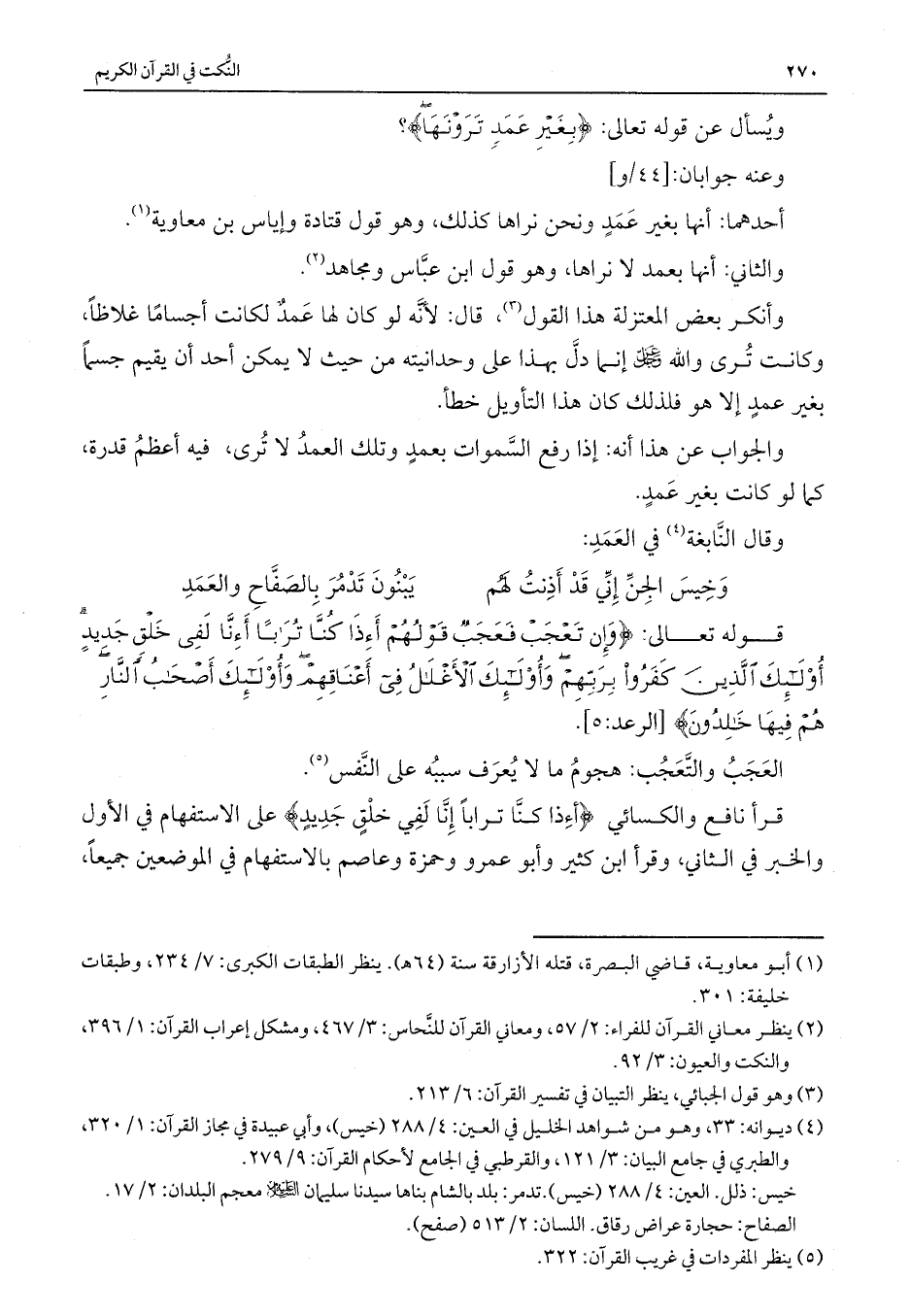 وأنكر بعض المعتزله هذا القول، قال: لأنه لو كان لهما عمد لكانت أجساماً غلاظاً، وكانت ترى والله - عز وجل - إنما دل بهذا على وحدانيته من حيث لا يمكن أحد أن يقيم جسماً بغير عمد إلا هو فلذلك كان هذا التأويل خطأ.
