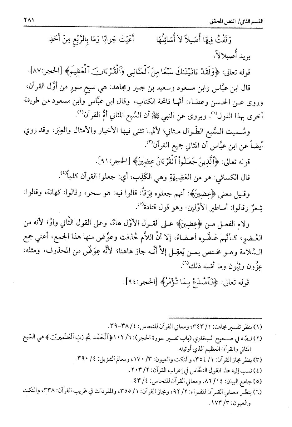 قال ابن عباس وابن مسعود وسعيد بن جبير ومجاهد: هي سبع سور من أول القرآن، وروى عن الحسن وعطاء: أنها فاتحة الكتاب، وقال ابن عباس وابن مسعود من طريقة أخرى بهذا القول. ويروى عن النبي - صلى الله عليه وسلم - أن السبع المثاني أم القرآن.