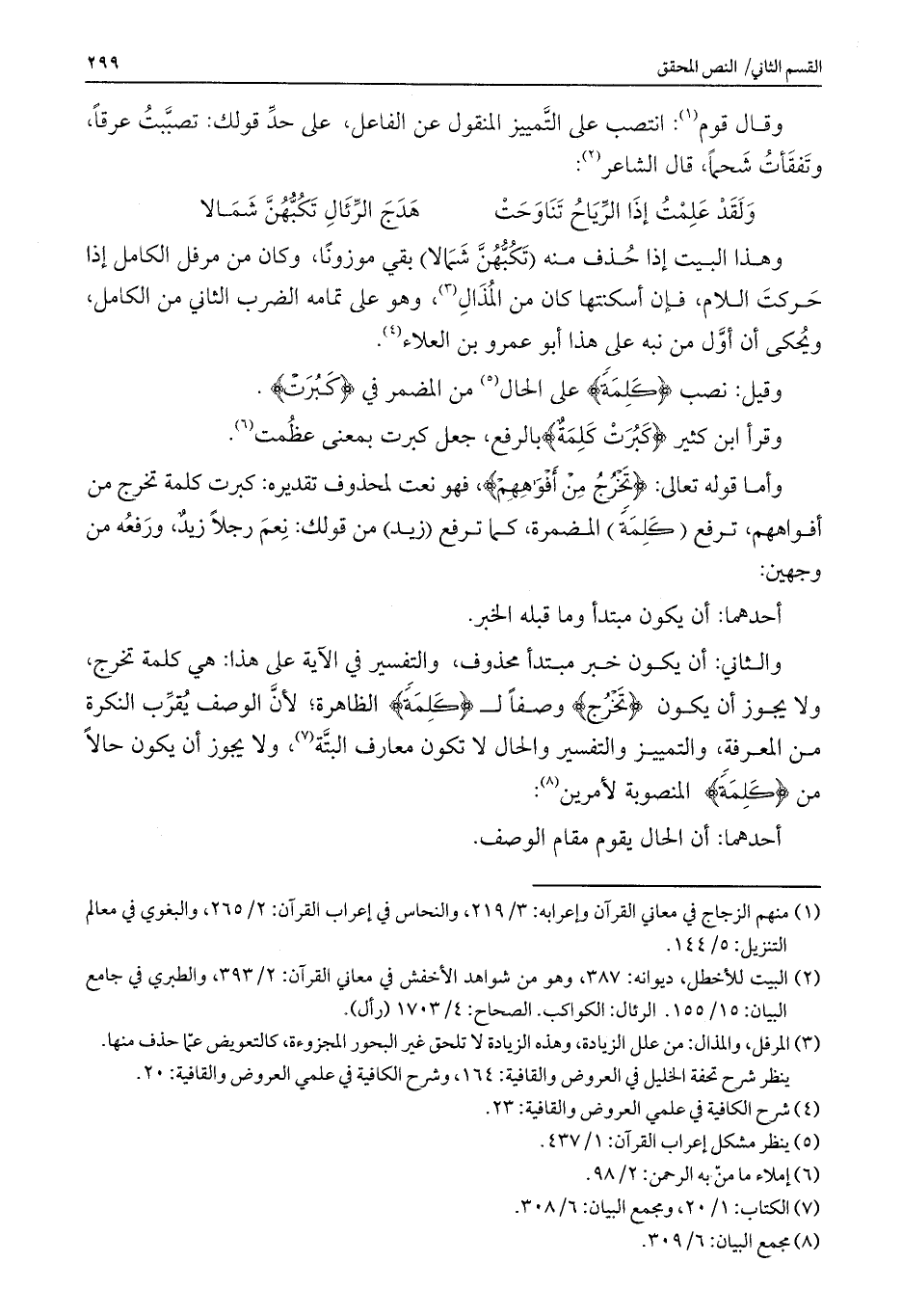 وأما قوله تعالى: {تَخْرُجُ مِنْ أَفْوَاهِهِمْ} ، فهو نعت لمحذوف تقديره: كبرت كلمة تخرج من أفواهم، ترفع (كلمة) المضمرة، كما ترفع (زيد) من قولك: نعم رجلاً زيد، ورفعه من وجهين: