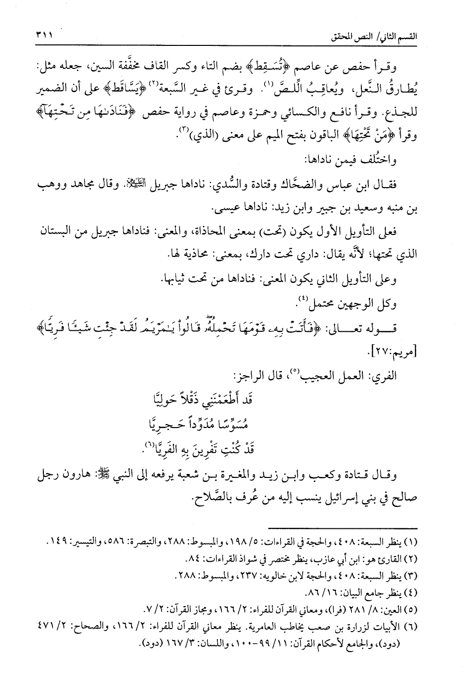 وقرأ حفص عن عاصم {تُسَاقِط} بضم التاء وكسر القاف مخففة السين، جعله مثل: يطارق النعل، ويعاقب اللص. قرئفي غير السبعة {تَسَاقِط} على أن الضمير للجذع. وقرأ نافع والكسائي وحمزة وعاصم فر راوية حفص {فَنَادَاهَا مِن تَحْتِهَا} وقرأ {مِنْ تَحْتِهَا} الباقون بفتح الميم على معنى (الذي) .