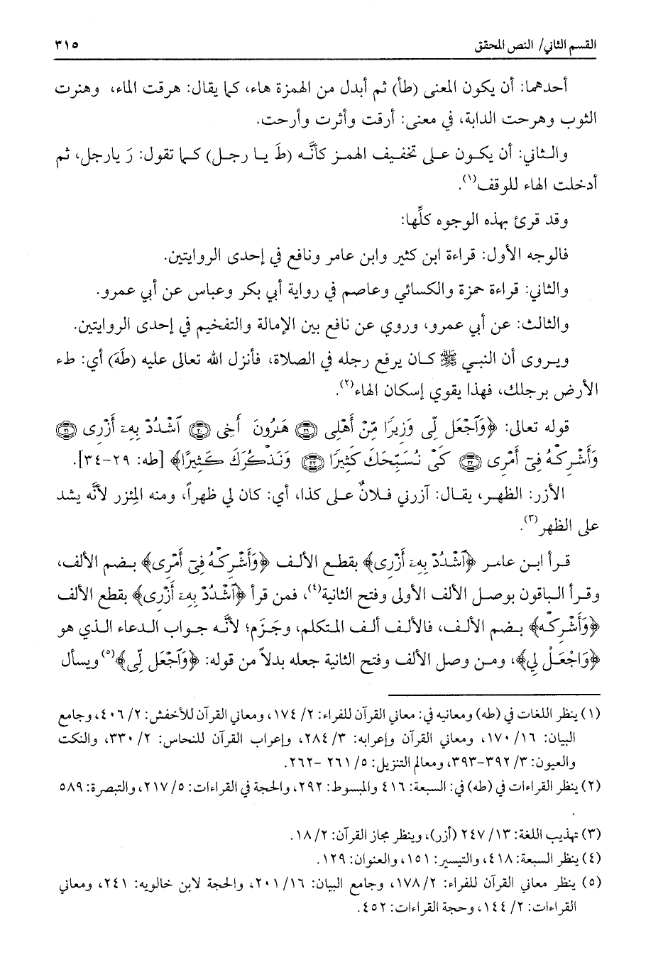 قرأ ابن عامر {اشْدُدْ بِهِ أَزْرِي} بقطع الألف {وَأَشْرِكْهُ فِي أَمْرِي} بضم الألف، وقرأ الباقون بوصل الألف الأولى وفتح الثانية، فمن قرأ {اشْدُدْ بِهِ أَزْرِي} بقطع الألف {وَأَشْرِكْهُ} بضم الألف، فالألف ألف المتكلم، وجزم؛ لأنه جواب الدعاء الذي هو {وَاجْعَلْ لِي} ، ومن وصل الألف وفتح الثانية جعله بدلاً من قوله: {وَاجْعَل لِي} ويسأل