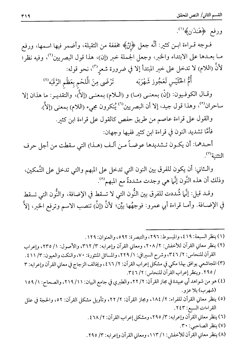 وقال الكوفيون: (إنْ) بمعنى (ما) و (اللام) بمعنى (إلاَّ) ، والتقدير: ما هذان إلا ساحران، وهذا قول جيد، إلا أن البصريين ينكرون مجئ (اللام) بمعنى (إلاَّ) .