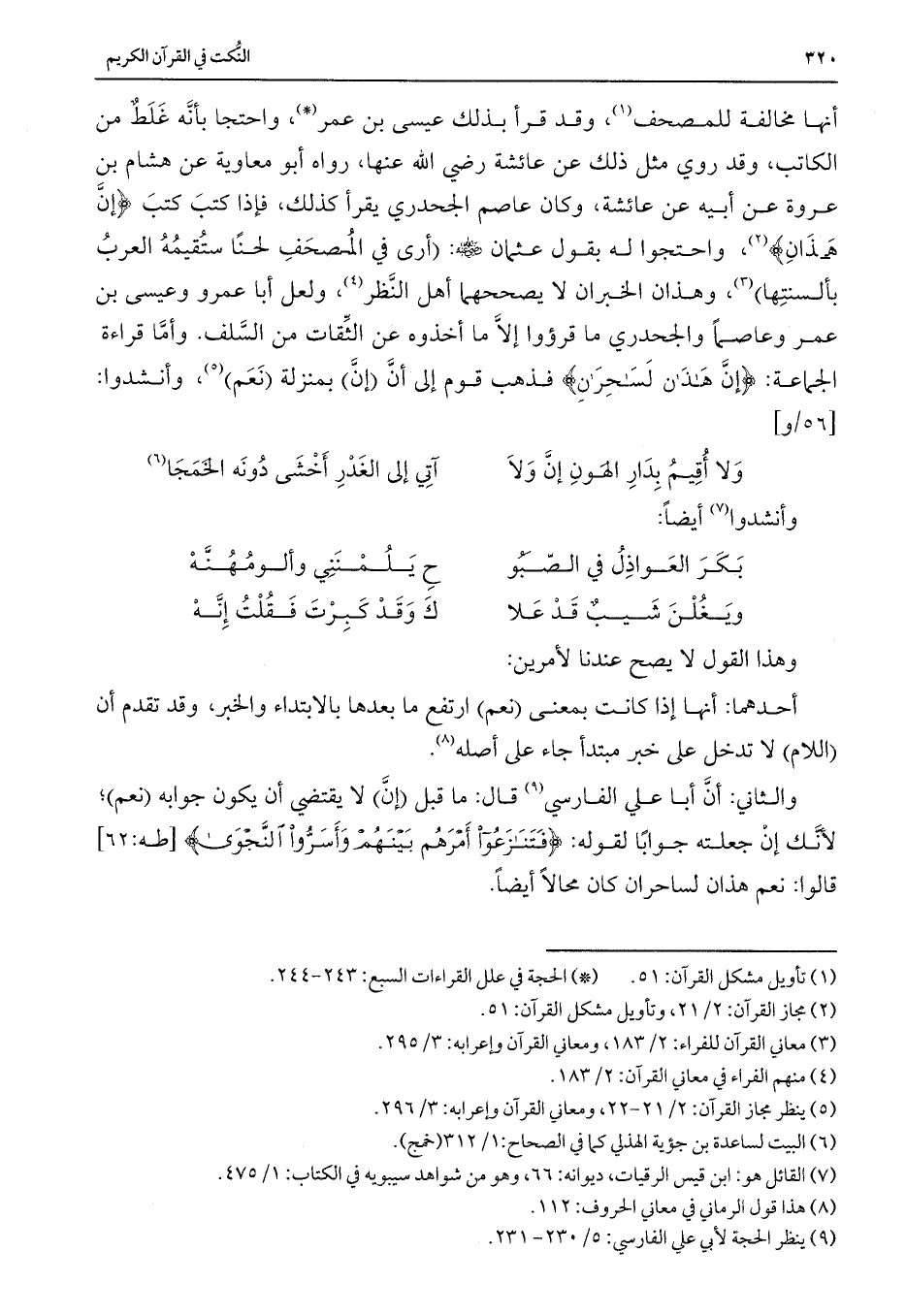 أنها مخالفة للمصحف، وقد قرأ بذلك عيسى بن عمر، واحتجا بأنه غلط من الكاتب، وقد روي مثل ذلك عن عائشة رضي الله عنها، رواه أبو معاوية عن هشام بن عروة عن أبيه عن عائسة، وكان عاصم الجحدري يقرأ كذلك، فإذا كتب كتب {إِنْ هَذَانِ} ، واحتجوا له بقول عثمان - رضي الله عنه -: (أرى في المصحف لحناً ستقيمه العرب بألسنتها) ، وهذان الخبران لا يصححهما أهل النظر، ولعل أبا عمرو وعيسى بن عمر وعاصماً والجحدري ما قرؤوا إلا ما أخذوه عن الثقات من السلف. وأما قراءة الجماعة: {إِنْ هَذَانِ لَسَاحِرَانِ} فذهب قوم إلى أن (إنَّ) بمنزلة (نعم) ، وأنشدوا: