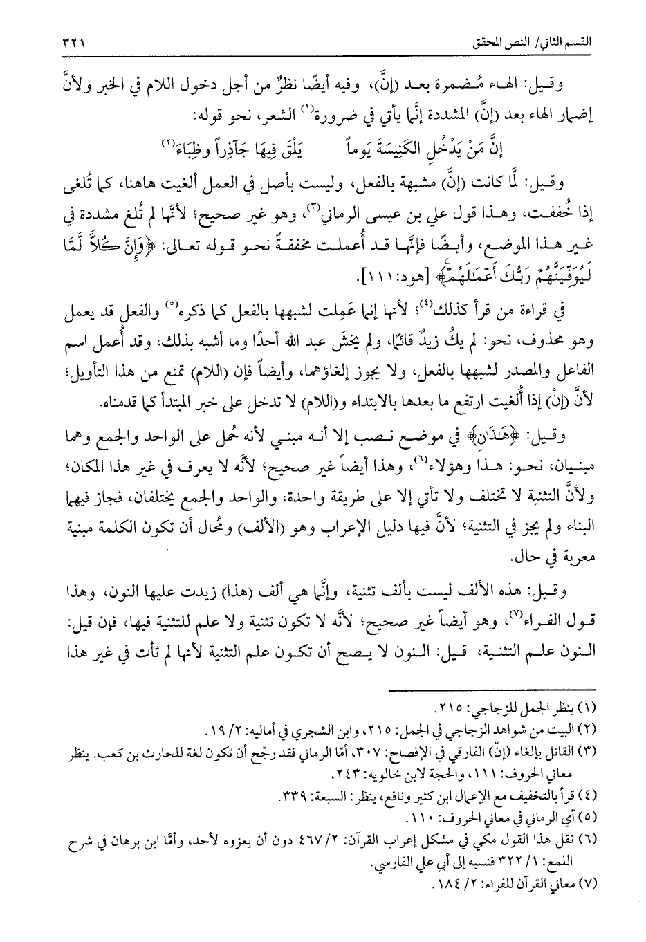 وقيل: لما كانت (إنَّ) مشبهة بالفغل، وليست بأصل في العمل ألغيت هاهنا، كما تلغي إذا خففت، وهذ قول علي بن عيسى الرماني، وهو غير صحيح؛ لأنها لم تلغ مشددة في غير هذا الموضع، وأيضاً فإنها قد أ'ملت مخففة نحو قوله تعالى: {وَإِنَّ كُلًّا لَمَّا لَيُوَفِّيَنَّهُمْ رَبُّكَ أَعْمَالَهُمْ} [هود: 111] .