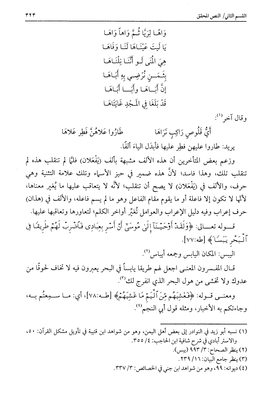 وزعم بعض المتأخرين أن هذه الألف مشبهة بألف (يفعلان) فلما لم تنقلب هذه لم تنقلب تلك، وهذا فاسد؛ ذلن هذه ضمير في حيز الأسماء وتلك علامة التثنية وهي حرف، والألف في (يفعلان) لا يصح أن تنقلب؛ لأنه لا يتعاقب عليها ما يغير معناها، لأنها لا تكون إلا فاعله أو ما يقوم مقام الفاعل وهو ما يسم فاعله، والألف في (هذان) حرف إعراب وفيه دليل الإعراب والعوامل تغير أواخر الكلم؛ لتعاورها وتعاقبها عليها.