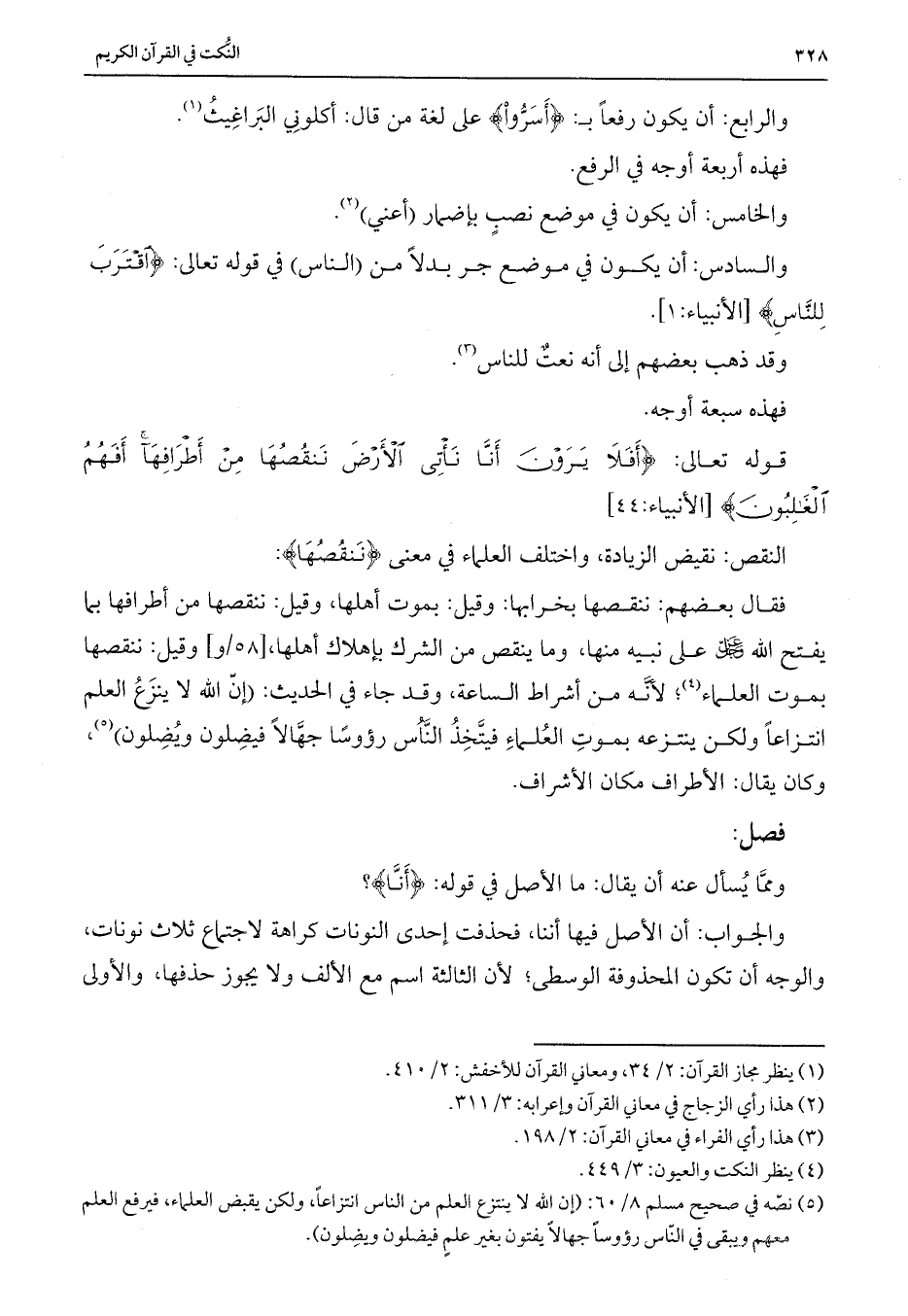 فقال بعضهم: ننقصها بخرابها: وقيل: بموت اهلها، وقيل ننقصها من أطرافها بما يفتح الله - عز وجل - على نبيه منها، وما ينقص من الشرك بإهلاك أهلها، وقيل: ننقصها بموت العلماء؛ لأنه من أشراط الساعة، وقد جاء في الحديث: (إن الله لا ينزع العلم انتزاعاً ولكن ينتزعه بموت العلماء فيتخذ الناس رؤوسا جهالاً فيضلون ويضلون) ، وكان يقال: الأطراف مكان الأشراف.