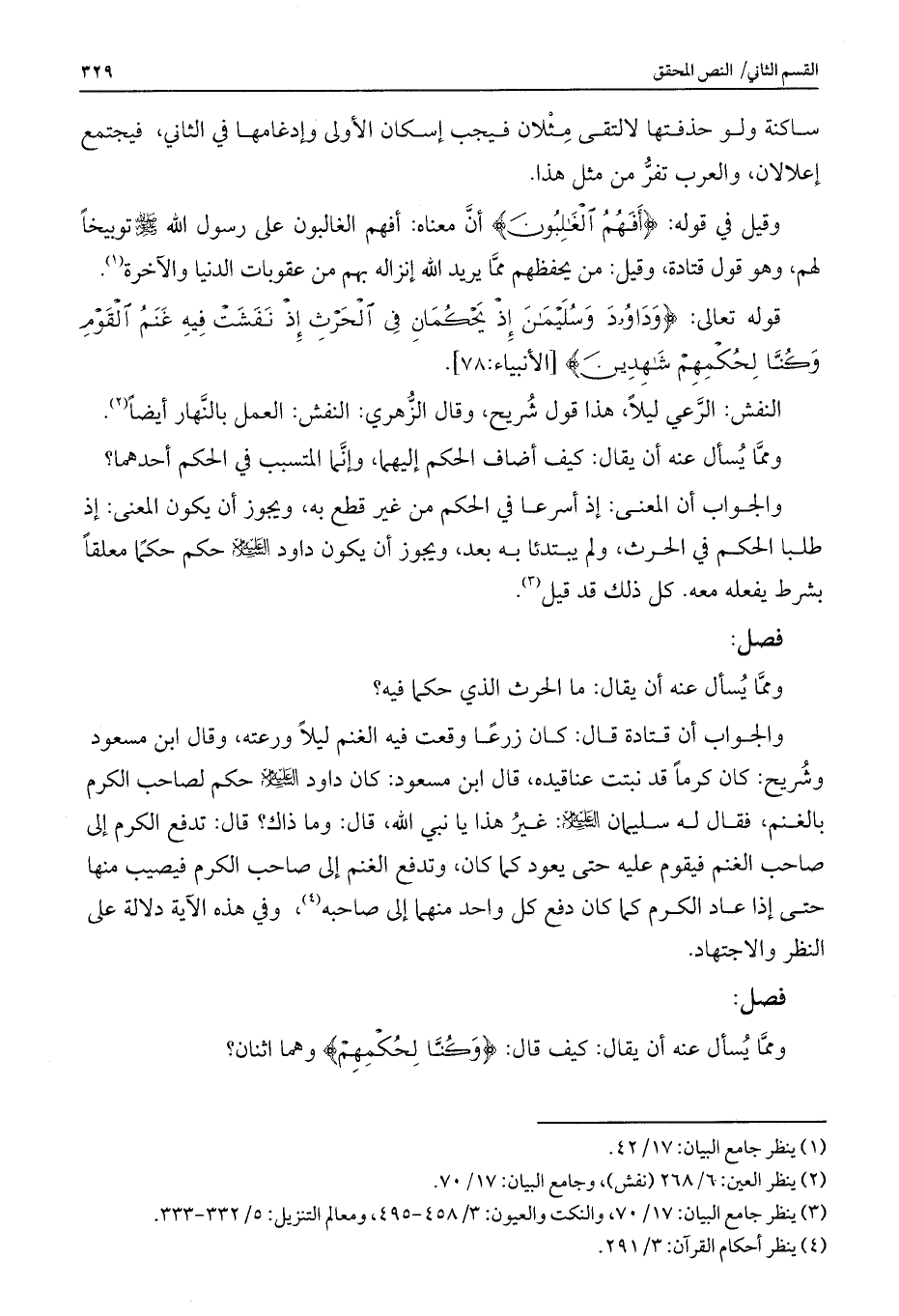 قوله تعالى: {وَدَاوُودَ وَسُلَيْمَانَ إِذْ يَحْكُمَانِ فِي الْحَرْثِ إِذْ نَفَشَتْ فِيهِ غَنَمُ الْقَوْمِ وَكُنَّا لِحُكْمِهِمْ شَاهِدِينَ} [الأنبياء: 78] .