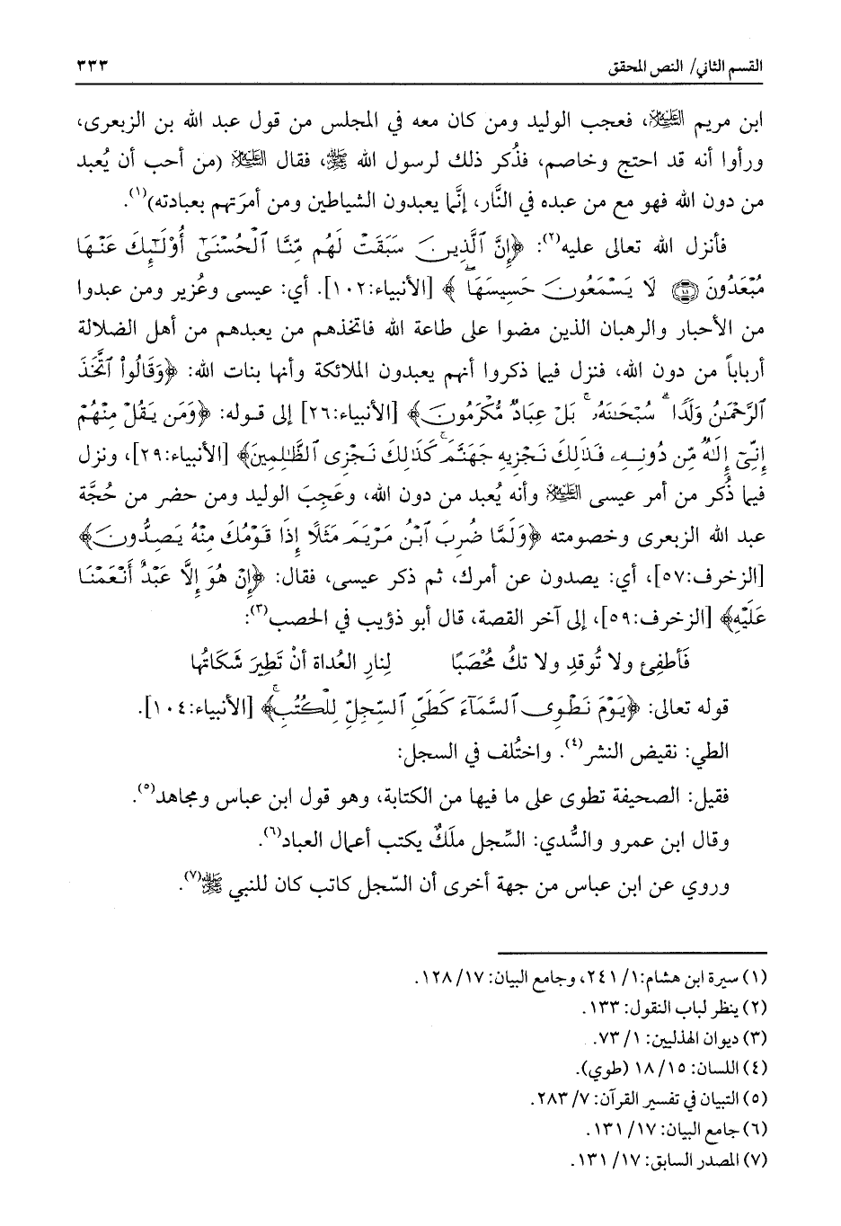 ابن مريم - عليه السلام -، فعجي الوليد ومن كان معه في المجلس من قول عبد الله بن الزبعرى، ورأوا أنه قد احتج وخاصم، فذكر ذلك لرسول الله - صلى الله عليه وسلم - فقال - عليه السلام - (من أحب أن يعبد من جون الله فهو مع من عبده في النار، إنما يعبدون الشياطين ومن أمرتهم بعبادته) . فأنزل الله تعالى عليه: {إِنَّ الَّذِينَ سَبَقَتْ لَهُمْ مِنَّا الْحُسْنَى أُولَئِكَ عَنْهَا مُبْعَدُونَ (101) لَا يَسْمَعُونَ حَسِيسَهَا} [الأنبياء: 102] . أي: عيسى وعزيز ومن عبدوا من الأحبار والرهبان الذين مضوا على طاعة الله فاتخذتهم من يعبدهم من أهل الضلالة أرباباً من دون الله، فنزل فيما ذكروا لأنهم يعبدون الملائكة وأنهم بنات الله: {وَقَالُوا اتَّخَذَ الرَّحْمَنُ وَلَدًا سُبْحَانَهُ بَلْ عِبَادٌ مُكْرَمُونَ} [الأنبياء: 26] إلى قوله: {وَمَنْ يَقُلْ مِنْهُمْ إِنِّي إِلَهٌ مِنْ دُونِهِ فَذَلِكَ نَجْزِيهِ جَهَنَّمَ كَذَلِكَ نَجْزِي الظَّالِمِينَ} [الأنبياء: 29] ، ونزل فيما ذكر من أمر عيسى - عليه السلام - وأنه يعبد من دون الله، وعجب الوليد ومن حضر من حجة عبد الله الزبعرى وخصومته {وَلَمَّا ضُرِبَ ابْنُ مَرْيَمَ مَثَلًا إِذَا قَوْمُكَ مِنْهُ يَصِدُّونَ} [الزخرف: 57] ، أي: يصجون عن أمرك، ثم ذكر عيسى، فقال: {إِنْ هُوَ إِلَّا عَبْدٌ أَنْعَمْنَا عَلَيْهِ} [الزخرف: 59] ، إلى آخر القصة، قال أبو ذؤيب في الحصب: