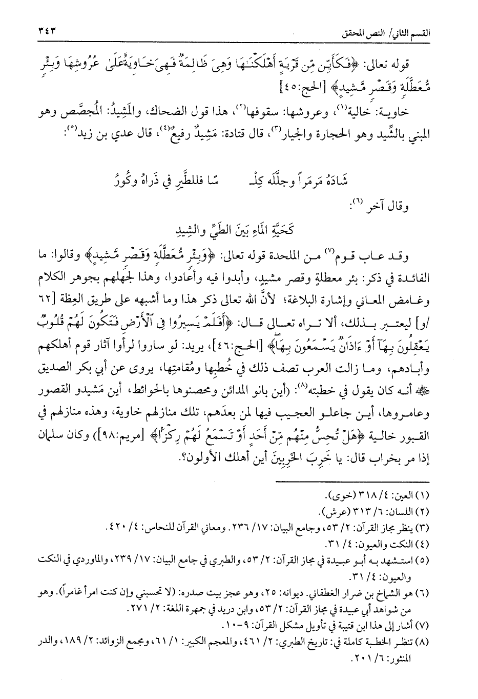 وقد عاب قوم من الملحدة قوله تعالى: {وَبِئْرٍ مُعَطَّلَةٍ وَقَصْرٍ مَشِيدٍ} وقالوا: ما الفائدة في ذكر: بئر معطلة وقصر مشيد، وأبدوا فيه وأعادوا، وهذا لجهلهم بجوهر الكلام وغامض المعاني وإشارة البلاغة؛ لأن الله تعالى ذكر هذا وما أشبهه على طريق العظة ليعتبر بذلك، ألا تراه تعالى قال: {أَفَلَمْ يَسِيرُوا فِي الْأَرْضِ فَتَكُونَ لَهُمْ قُلُوبٌ يَعْقِلُونَ بِهَا أَوْ آذَانٌ يَسْمَعُونَ بِهَا} [الحج: 46] ، يريد: لو ساروا لرأوا آثار قوم أهلكهم وأبادهم، ومازالت العرب تصف ذلك في خطبها ومقامتها، يروى عن أبي بكر الصديق - رضي الله عنه - أنه كان يقول في خطبته: (أين بانو المدائن ومحصنوها بالحوائط، أين مشيدو القصور وعامروها، أين جاعلو العجيب فيها لمن بعدهم، تلك منازلهم خاوية، وهذه منازلهم في القبور خالية {هَلْ تُحِسُّ مِنْهُمْ مِنْ أَحَدٍ أَوْ تَسْمَعُ لَهُمْ رِكْزًا} [مريم: 98] ) وكان سلمان إذا مر بخراب قال: يا خرب الخربين أين أهلك الأولون؟.