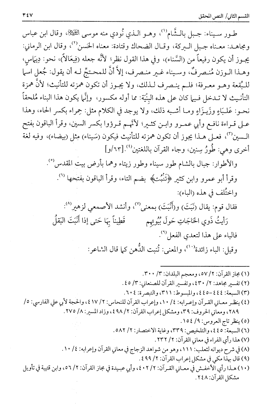 طور سناء: جبل الشام، وهو الذي نودي موسى - عليه السلام -، وقال ابن عباس ومجاهد: معناه جبل البركة، وقال الضحاك وقتادة: معناه الحسن، وقال ابن الرماني: يجوز أن يكون رفيعاً من (السناء) ، وفي هذا القول نظر؛ لأنه جعله (فيغالاً) ، نحو: ديماس، وهذا الوزن منصرف، وسيناء غير منصرف، إلا أن للمحتج له أن يقول: جعل اسما للبقعة وهو معرفة؛ فلم ينصرف لذلك، ولا يجوز أن تكون همزته للتأنيث؛ لأن همزة التأنيث لا تدخل فيما كان على هذه البنية: مما لأوله مكسور، وإنما يكون هذا البناء ملحقاً نحو: علباء وزيزاء وما أشبه ذلك، ولا يوجد في الكلام مثل: حمراء بكسر الحاء، وهذا على قراءة نافع وأبي عمرو وابن كثير؛ لأنهم قرؤوا بكسر السين، وقرأ الباقون بفتح السين، فعلى هذا يجوز أن تكون همزته للتأنيث فيكون (سيناء) مثل (بيضاء) ، وفيه لغة أخرى وهي: طور سنين، وجاء القرآن باللغتين.