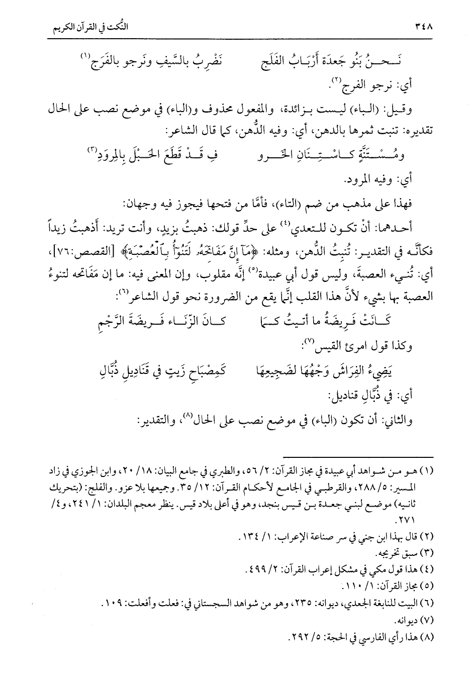 أحدهما: أن تكون للتعدي على حد قولك: ذهبت بزيد، وأنت تريد: أذهبت زيداً فكأنه في التقدير: تنبت الدهن، ومثله: {مَا إِنَّ مَفَاتِحَهُ لَتَنُوءُ بِالْعُصْبَةِ} [القصص: 76] ، أي: تنيء العصبة، وليس قول أبي عبيدة إنه مقلوب، وإن المعنى فيه: ما إن مفاتحه لتنوء العصبة بها بشيء لأن هذا القلب إنما يقع من الضرورة نحو قول الشاعر: