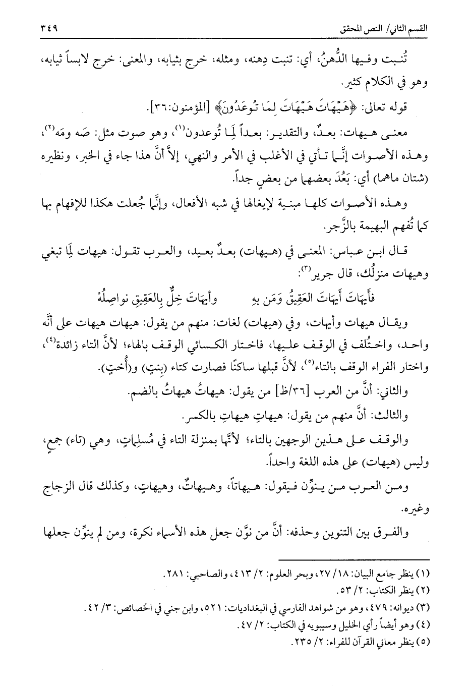 فأيهات أيهات العقيق ومن به وأيهات خل بالعقيق نواصله ويقال هيهات وأيهات، وفي (هيهات) لغات: منهم من يقول: هيهات على أنه واحد، واختلف في الوقف عليها، فاختار الكسائي الوقف بالهاء؛ لأن التاء زائدة، واختار الفراء الزقف بالتاء، لأن قبلها ساكناً فصارت كتاء (بنت) و (أخت) .