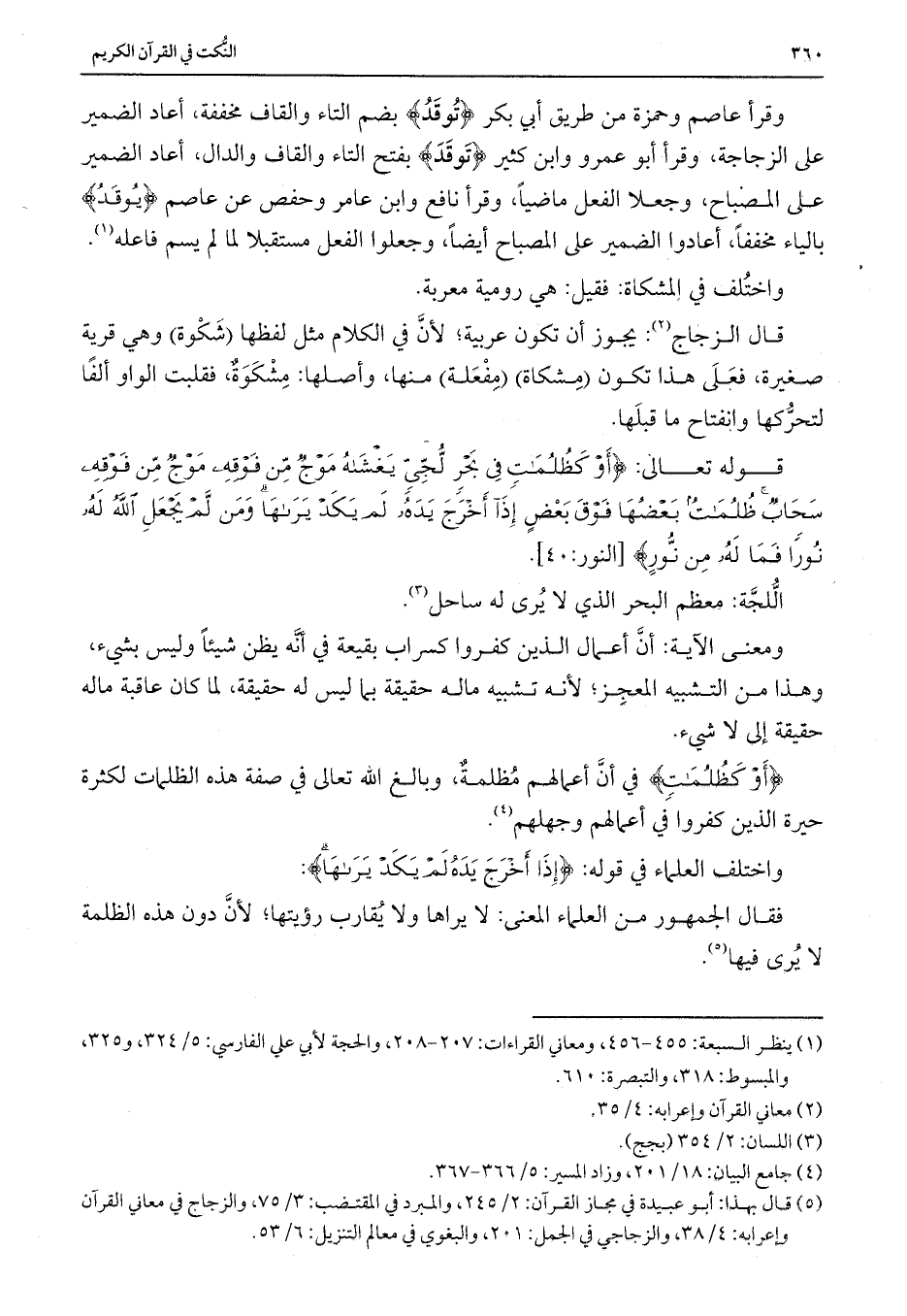 قال الزجاج: يجوز أن تكون عربية؛ لأن في الكلام مثل لفظها (شكوة) وهي قرية صغيرة، فعلى هذا تكون (مشكاة) (مفعلة) منها، وأصلها، مشكوة، فقلبت الواو ألفا لتحركها وانفتاح ما قبلها.