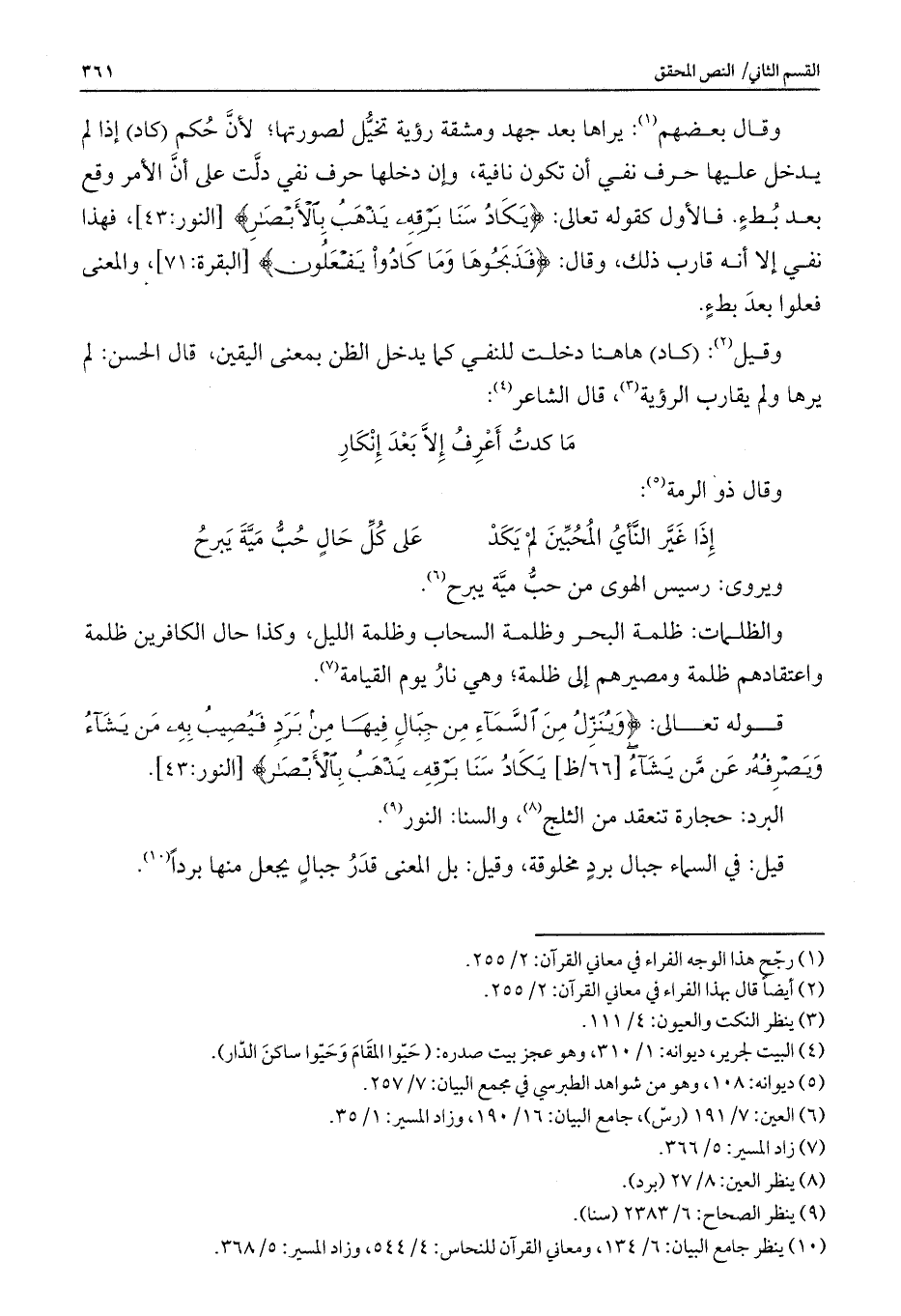 وقال بعضهم: يراها بعد جهد ومشقة رؤية تخيل لصورتها؛ لأن حكم (كاد) إذا لم يدخل عليها حرف نفي أن تكون نافية، وإن دخلها حرف نفي دلت على أن الأمر وقع بعد بطء. فالأول كقوله تعالى: {يَكَادُ سَنَا بَرْقِهِ يَذْهَبُ بِالْأَبْصَارِ} [النور: 43] ، فهذا نفي إلا أنه قارب ذلك، وقال: {فَذَبَحُوهَا وَمَا كَادُوا يَفْعَلُونَ} [البقرة: 71] ، والمعنى فعلوا بعد بطء.