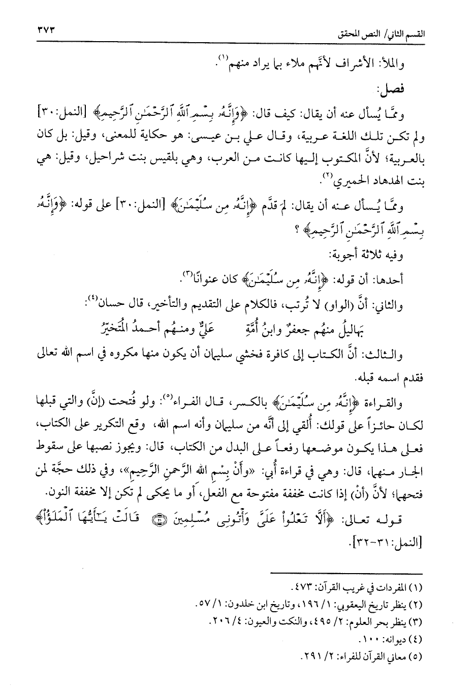 ومما يسأل عنه أن يقال: كيف قال: {وَإِنَّهُ بِسْمِ اللَّهِ الرَّحْمَنِ الرَّحِيمِ} [النمل: 30] ولم تكن تلك اللغة عربية، وقال علي بن عيسى: هو حكاية للمعنى، وقيل: بل كان بالعربية؛ لأن المكتوب إليها كانت من العرب، وهي بلقيس بنت شراحيل، وقيل: هي بنت الهدهاد الحميري.