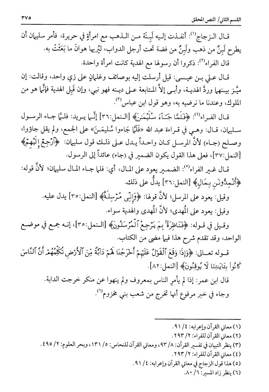 قال الفراء: {فَلَمَّا جَاءَ سُلَيْمَانَ} [النمل: 36] إنما يريد: فلما جاء الرسول سليمان، قال: وهي في قراءة عبد الله "فلما جاءوا سليمن" على الجمع، ولم يقل جاؤوا، وصلح (جاء) لأن المرسل كان واحداً يدل على ذلك قول سليمان: {ارْجِعْ إِلَيْهِمْ} [النمل: 37] ، فعلى هذا القول يكون الضمير في (جاء) عائداً إلى الرسول.