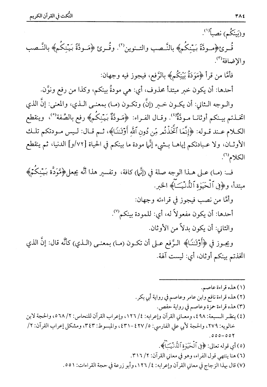 والوجه الثاني: أن يكون خبر (إنَّ) وتكون (ما) بمعنى الذي، والمعنى: إن الذي اتخذتم بينكم أوثانا مودة. وقال الفراء: {مَوَدَّةٌ بَيْنِكُم} رفع بالصفة، وينقطع الكلام عند قوله: {إِنَّمَا اتَّخَذْتُمْ مِنْ دُونِ اللَّهِ أَوْثَانًا} ، ثم قال: ليس مودتكم تلك الأوثان، ولا عبادتكم إياها بشيء إنما مودة ما بينكم في الحياة الدنيا، ثم ينقطع الكلام.
