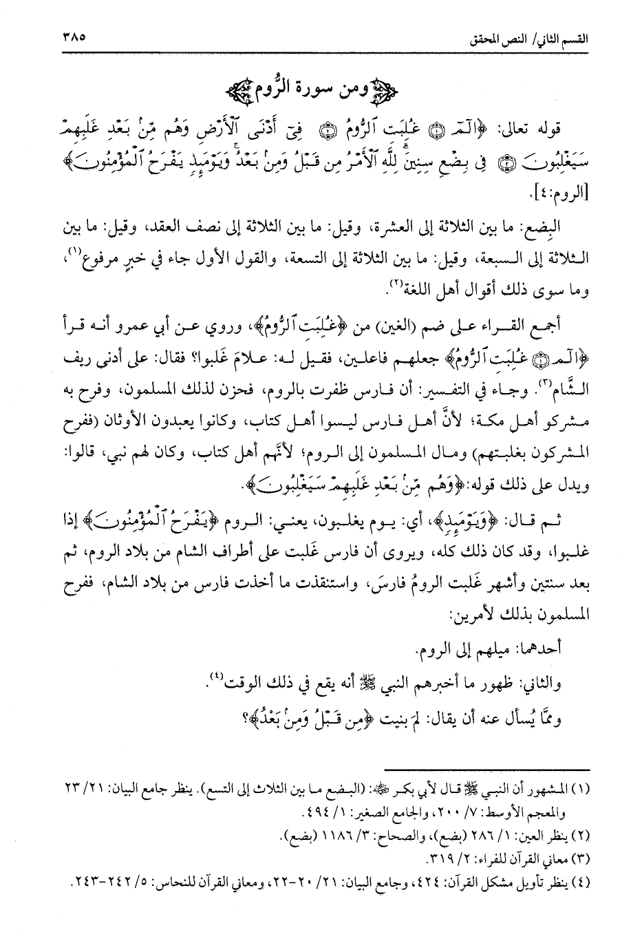 قوله تعالى: {الم (1) غُلِبَتِ الرُّومُ (2) فِي أَدْنَى الْأَرْضِ وَهُمْ مِنْ بَعْدِ غَلَبِهِمْ سَيَغْلِبُونَ (3) فِي بِضْعِ سِنِينَ لِلَّهِ الْأَمْرُ مِنْ قَبْلُ وَمِنْ بَعْدُ وَيَوْمَئِذٍ يَفْرَحُ الْمُؤْمِنُونَ} [الروم: 4] .