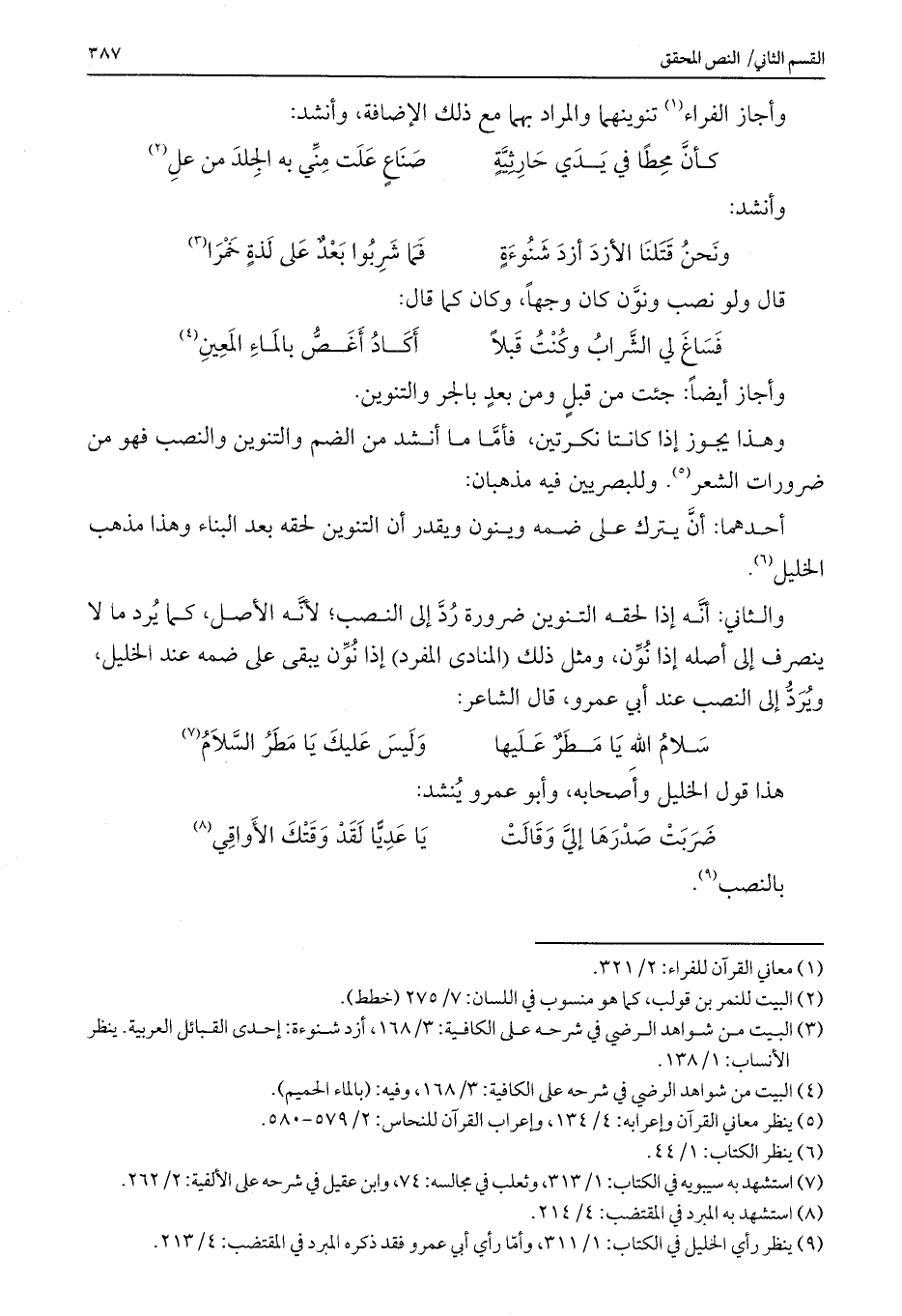 والثاني: أنه إذا لحقه التنوين ضرورة رد إلى النصب؛ لأنه الأصل، كما يرد ما لا ينصرف إلى أصله إذا نون، ومثل ذلك (المنادى المفرد) إذا نون يبقى على ضمه عند الخليل، ويرد إلى النصب عند أبي عمرو، قال الشاعر: