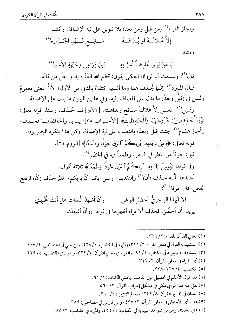 قال المبرد: إنما يحذف هذا وما أشبهه اكتفاء بالثاني من الأول؛ لأن المعنى مفهوم وليس في (قبل وبعد) ما يدل على المضاف إليه، وفي هذين البيتين ما يدل على الإضافة.