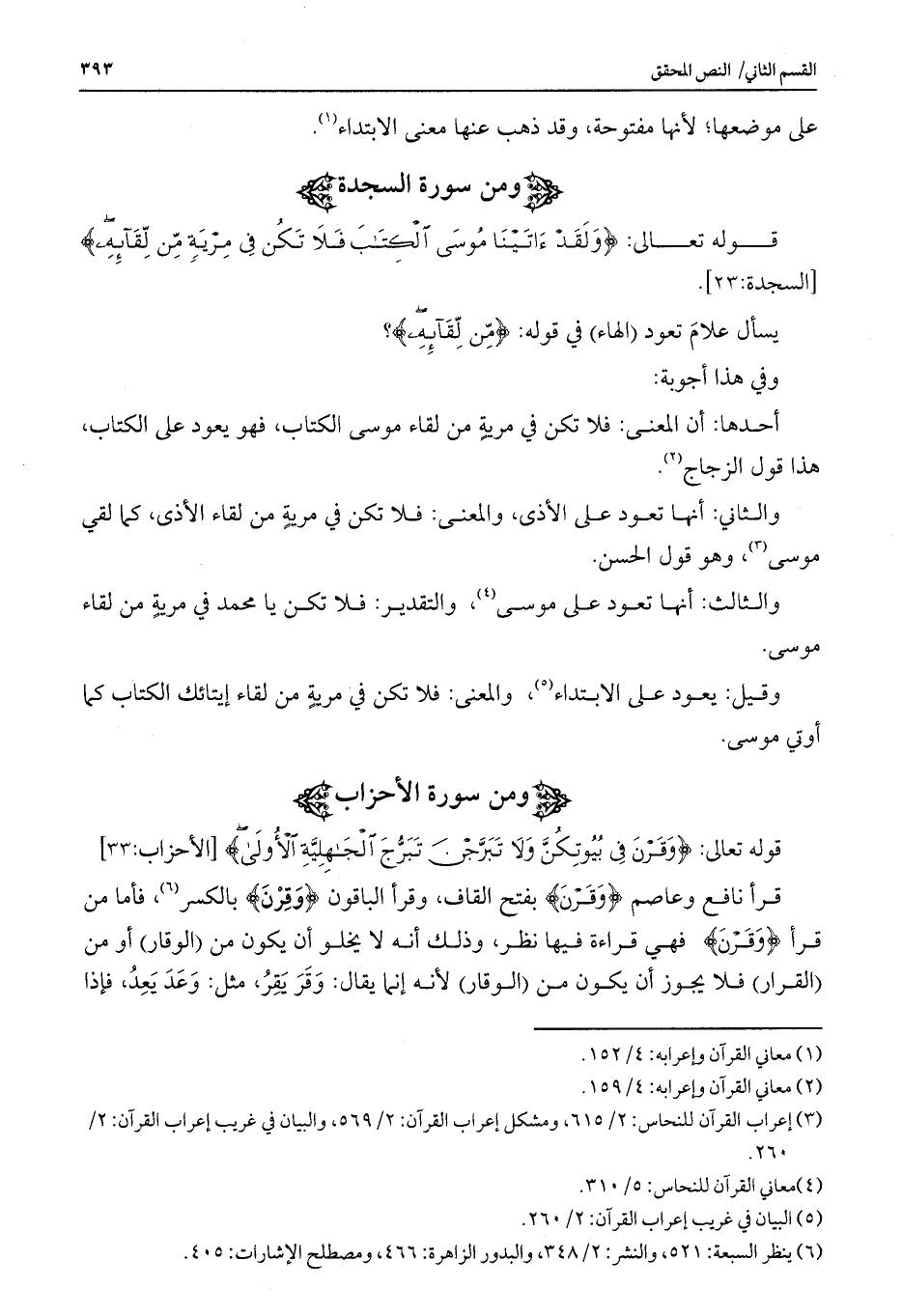 أحدها: أن المعنى: فلا تكن في مرية من لقاء موسى الكتاب، فهو يعود على الكتاب، هذا قول الزجاج.