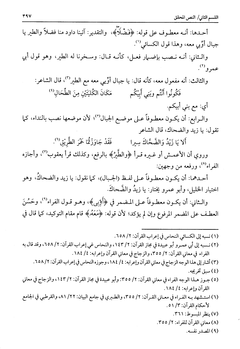 أحدهما: أن يكون معطوفاً على لفظ (الجبال) ، كما تقول: يا زيد والضحاك، وهو اختيار الخليل، وأبو عمرو يختار: يا زيد والضحاك.