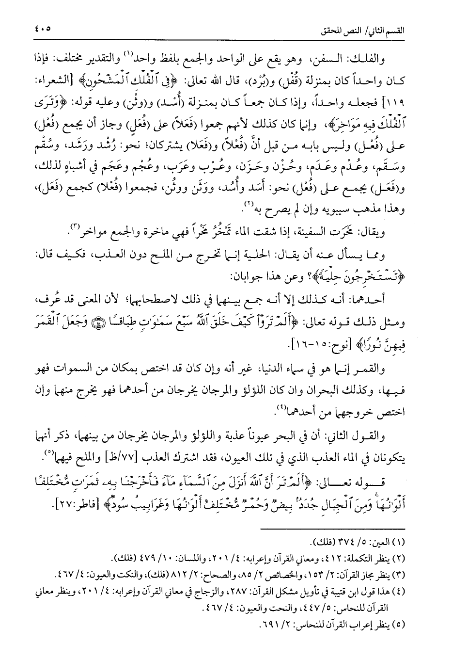 والفلك: السفن، وهو يقع على الواحد والجمع بلفظ واحد والتقدير مختلف: فإذا كان واحداً كان بمنزلة (قفل) و (برد) ، قال الله تعالى: {فِي الْفُلْكِ الْمَشْحُونِ} [الشعراء: 119] فجعله واحداً، وإذا كان جمعاً كان بمنزلة (أسد) و (وثن) وعليه قوله: {وترى الفلك} ، وإنما كان كذلك لأنهم جمعوا (فلاً) على (فعل) وجاز أن يجمع (فعل) على (فعل) وليس بابه من قبل أن (فعلاً) و (فعلا) يشتركان؛ نحو: رُشْد ورَشَد، وسُقَم وسَقَم، وعُدْم وعَدَم، وحُزْن وحَزَن، وعُرْب وعَرَب، وعُجْم وعَجَم في أشباهٍ لذلك، و (فعل) يجمع على (فعل) نحو: أسد وأسد، ووثن ووثن، فجمعوا (فعلا) كجمع (فعل) ، وهذا مذهب سيبويه وإن لم يصرح به.