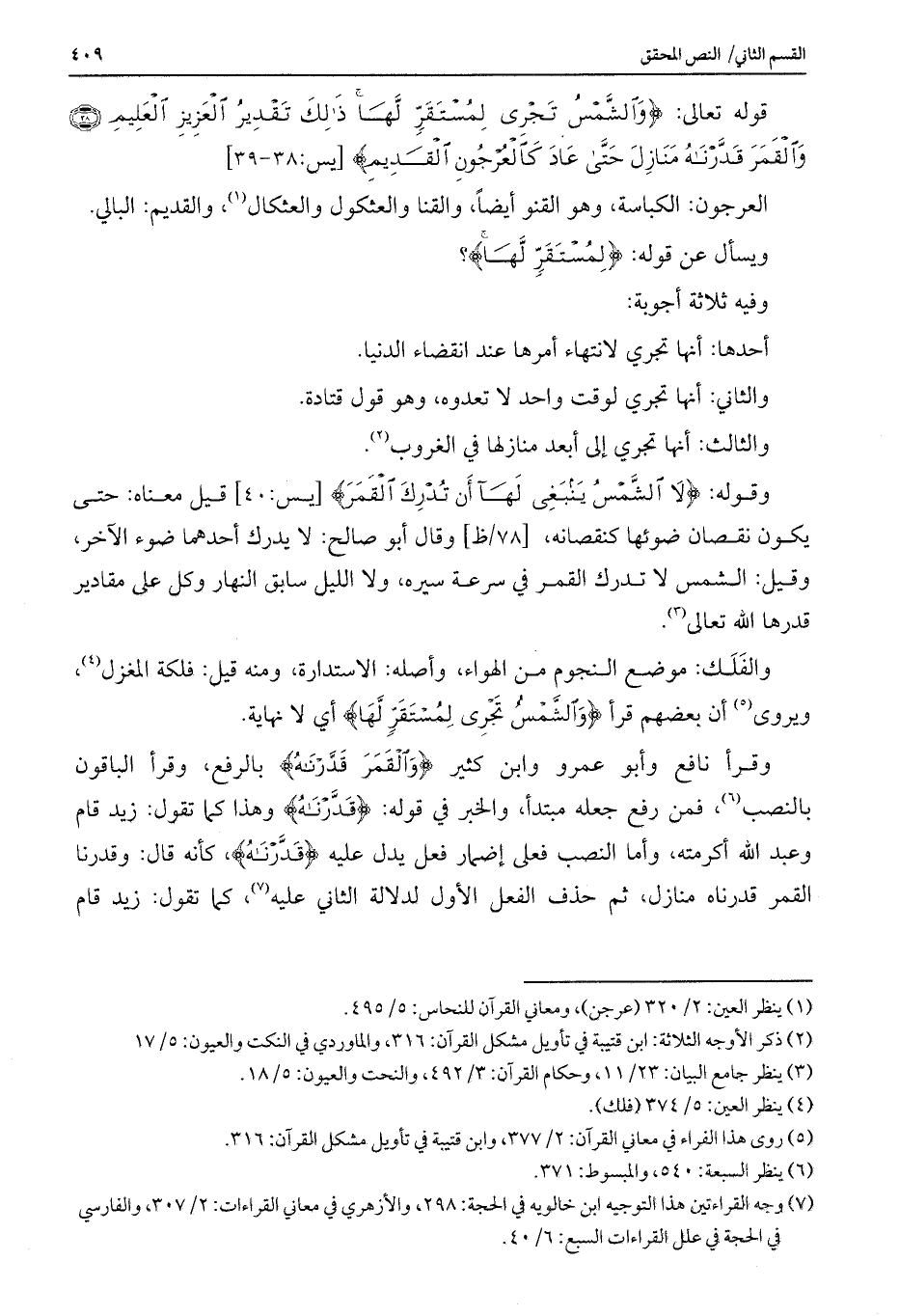 قوله تعالى: {وَالشَّمْسُ تَجْرِي لِمُسْتَقَرٍّ لَهَا ذَلِكَ تَقْدِيرُ الْعَزِيزِ الْعَلِيمِ (38) وَالْقَمَرَ قَدَّرْنَاهُ مَنَازِلَ حَتَّى عَادَ كَالْعُرْجُونِ الْقَدِيمِ} [يس: 38-39]
