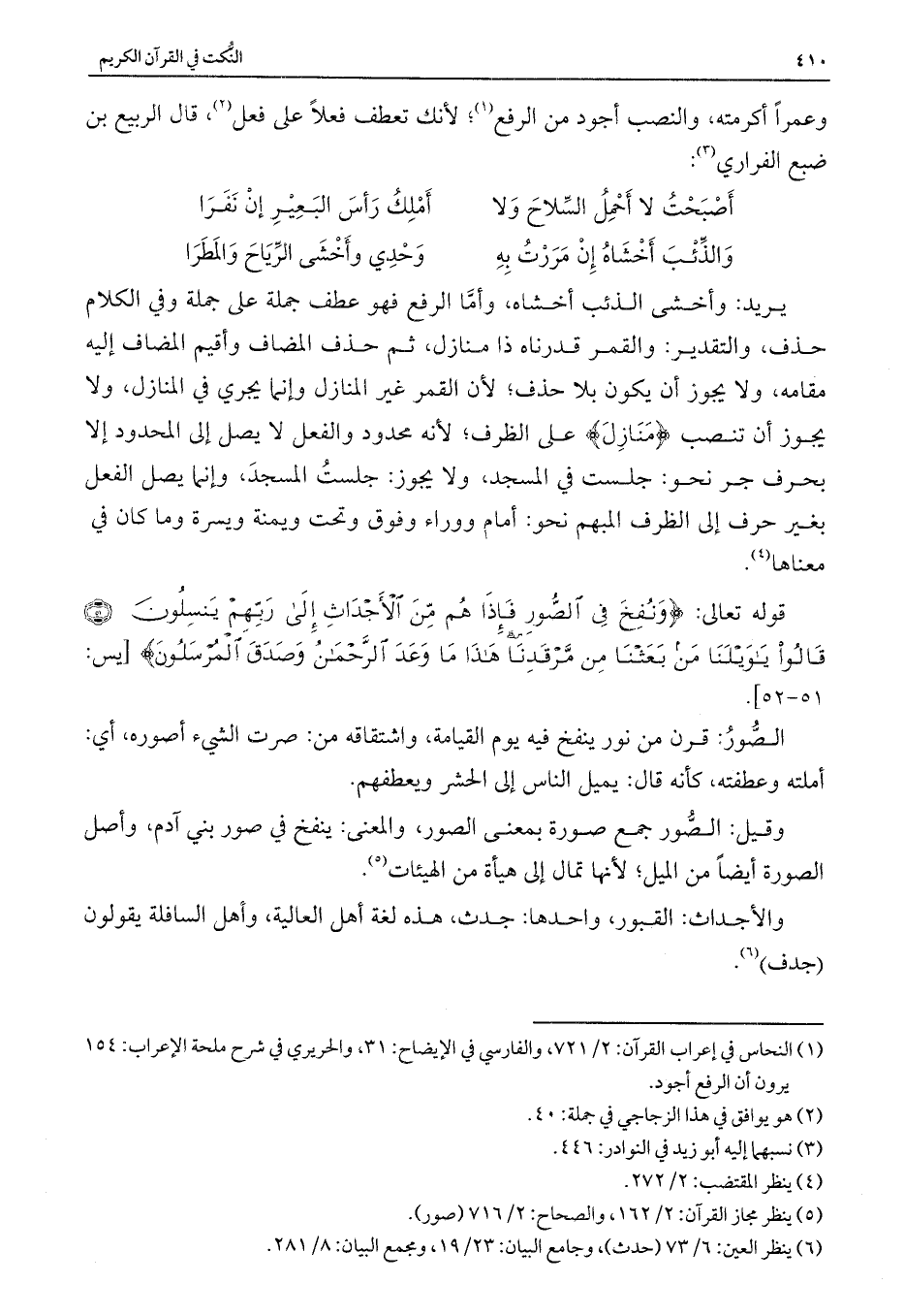 يريد: وأخشى الذئب أخشاه، وأما الرفع فهو عطف جملة على جملة وفي الكلام حذف، والتقدير: والقمر قدرناه ذا منازل، ثم حذف المضاف وأقيم المضاف إليه مقامه، ولا يجوز أن يكون بلا حذف؛ لأن القمر غير المنازل وإمما يجري في المنازل, ولا يجوز أن تنصب {مَنَازِلَ} على الظرف؛ لأنه محدود والفعل لا يصل إلى المحدود إلا بحرف جر نحو: جلست في المسجد، ولا يجوز: جلست المسجد، وإنما يصل الفعل بغير حرف إلى الظرف المبهم نحو: أمام ووراء وفوق وتحت ويمنة ويسرة وما كان في معناها.