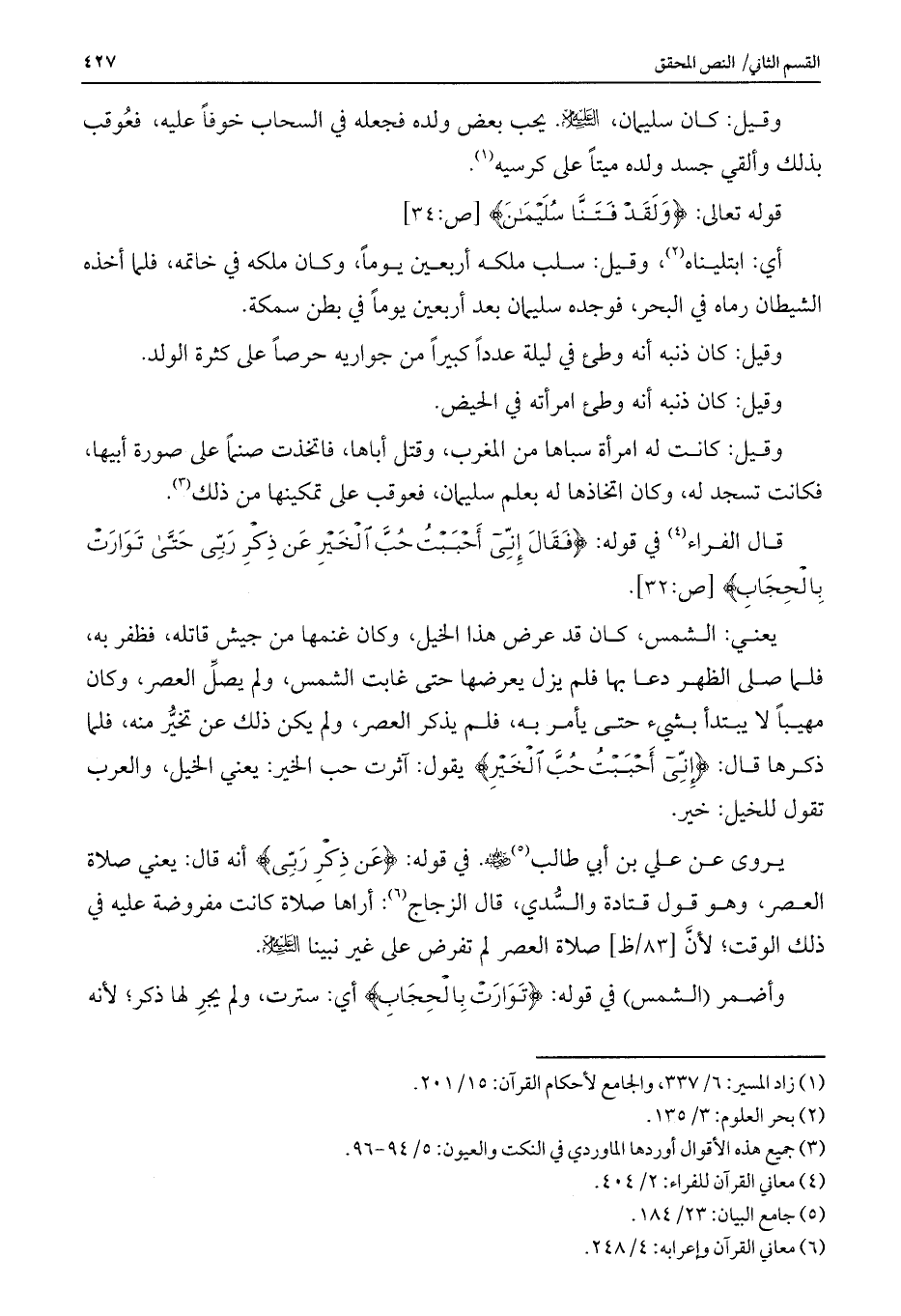 وقيل: كان سليمان، - عليه السلام. يحب بعض ولده فجعله في السحاب خوفاً عليه، فعوقب بذلك وألقي جسد ولده ميتاً على كرسيه.