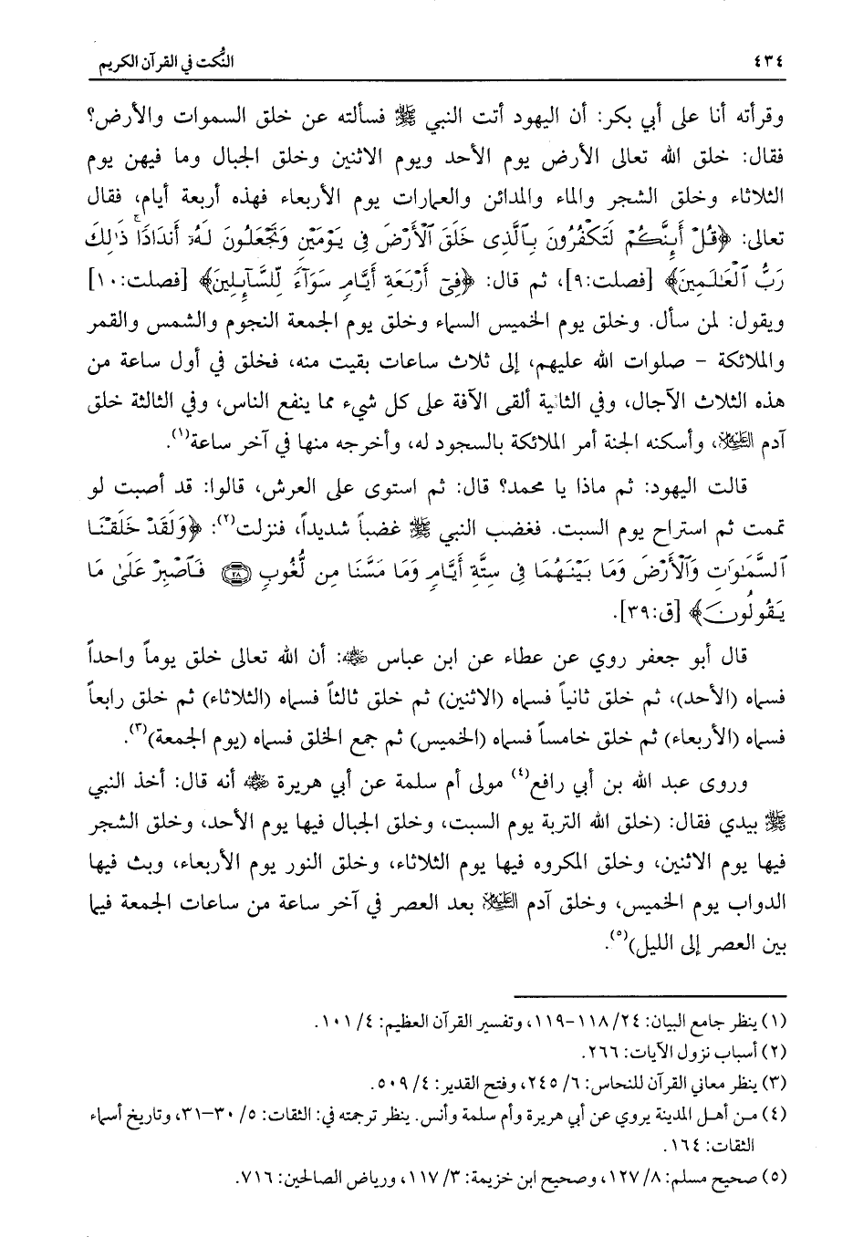 وقرأته أنا على أبي بكر: أن اليهود أتت النبي - صلى الله عليه وسلم - فسألته عن خلق السموات والأرض؟ فقال: خلق الله تعالى الأرض يوم الأحد ويوم الاثنين وخلق الجبال وما فيهن يوم الثلاثاء وخلق الشجر والماء والمدائن والعمارات يوم الأربعاء فهذه أربعة أيام، فقال تعالى: {قُلْ أَئِنَّكُمْ لَتَكْفُرُونَ بِالَّذِي خَلَقَ الْأَرْضَ فِي يَوْمَيْنِ وَتَجْعَلُونَ لَهُ أَنْدَادًا ذَلِكَ رَبُّ الْعَالَمِينَ} [فصلت: 9] ، ثم قال: {فِي أَرْبَعَةِ أَيَّامٍ سَوَاءً لِلسَّائِلِينَ} [فصلت: 10] ويقول: لمن سأل. وخلق يوم الخميس السماء وخلق يوم الجمعة النجوم والشمس والقمر والملائكة - صلوات الله عليهم، إلى ثلاث ساعات بقيت منه، فخلق في أول ساعة من هذه الثلاث الآجال، وفي الثانية ألقى الآفة على كل شيء مما ينفع الناس، وفي الثالثة خلق آدم - عليه السلام -، وأسكنه الجنة أمر الملائكة بالسجود له، وأخرجه منها في آخر ساعة.