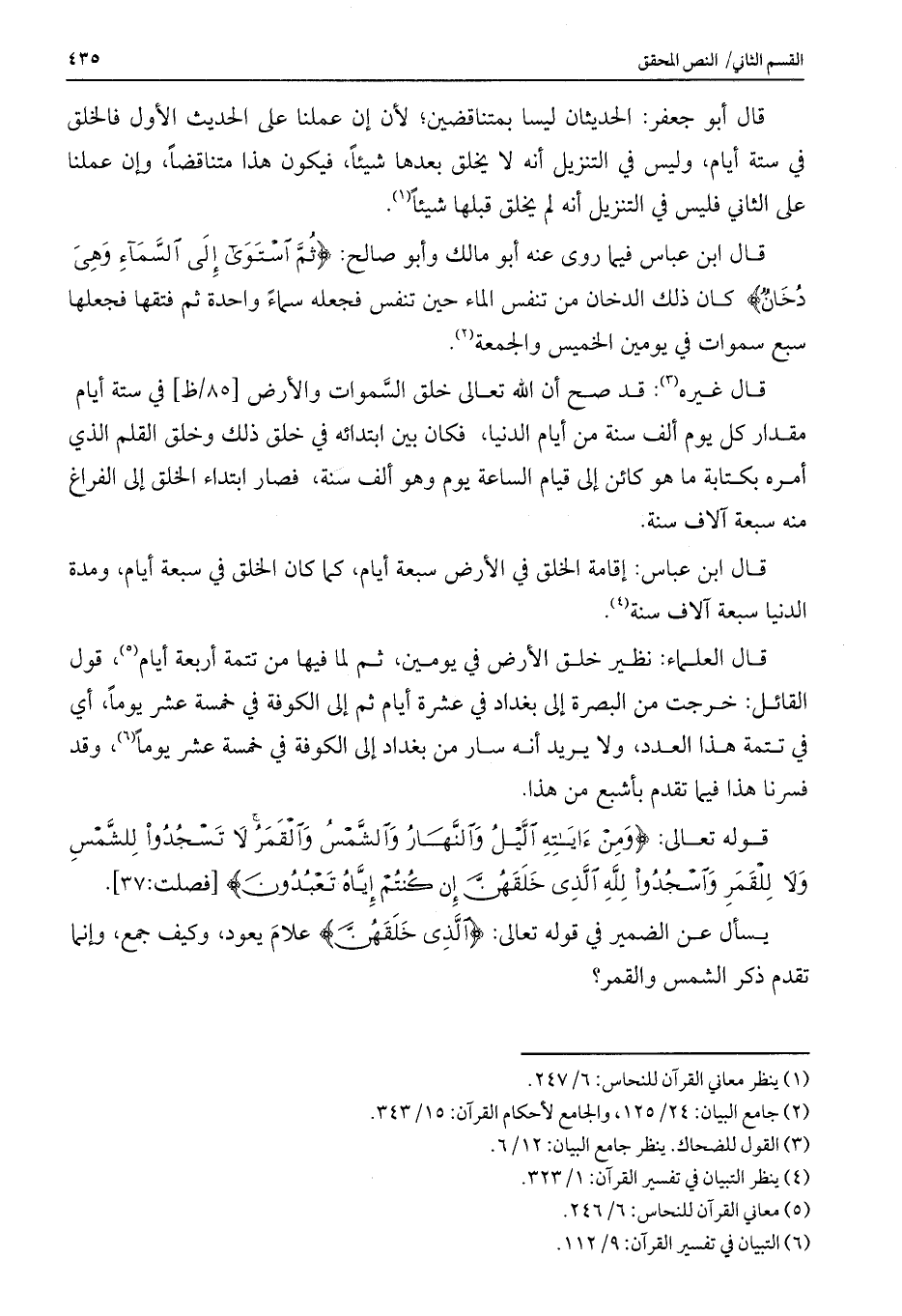 قال أبو جعفر: الحديثان ليسا بمتناقضين؛ لأن إن عملنا على الحديث الأول فالخلق في ستة أيام، وليس في التنزيل أنه لا يخلق بعدها شيئا، فيكون هذا متناقضا، وإن عملنا على الثاني فليس في التنزيل أنه لم يخلق قبلها شيئا.