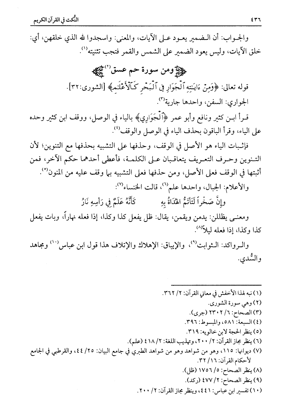 قرأ ابن كثير ونافع وأبو عمر {الجَوَارِي} بالياء في الوصل، ووقف ابن كثير وحده على الياء، وقرأ الباقون بحذف الياء في الوصل والوقف.