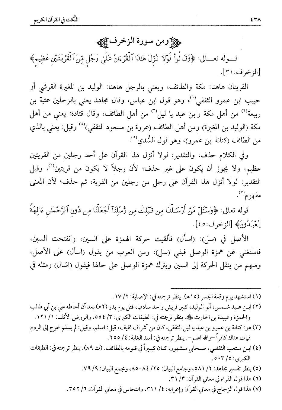 القريتان هاهنا: مكة والطائف، ويعني بالرجل هاهنا: الوليد بن المغيرة القرشي أو حبيب ابن عمرو الثقفي، وهو قول ابن عباس، وقال مجاهد يعني بالرجلين عتبة بن ربيعة من أهل مكة وابن عبد يا ليل من أهل الطائف، وقال قتادة: يعني من أهل مكة (الوليد بن المغيرة) ومن أهل الطائف (عروة بن مسعود الثقفي) وقيل: يعني بالذي من الطائف (كنانة ابن عمرو) ، وهو قول السدي.