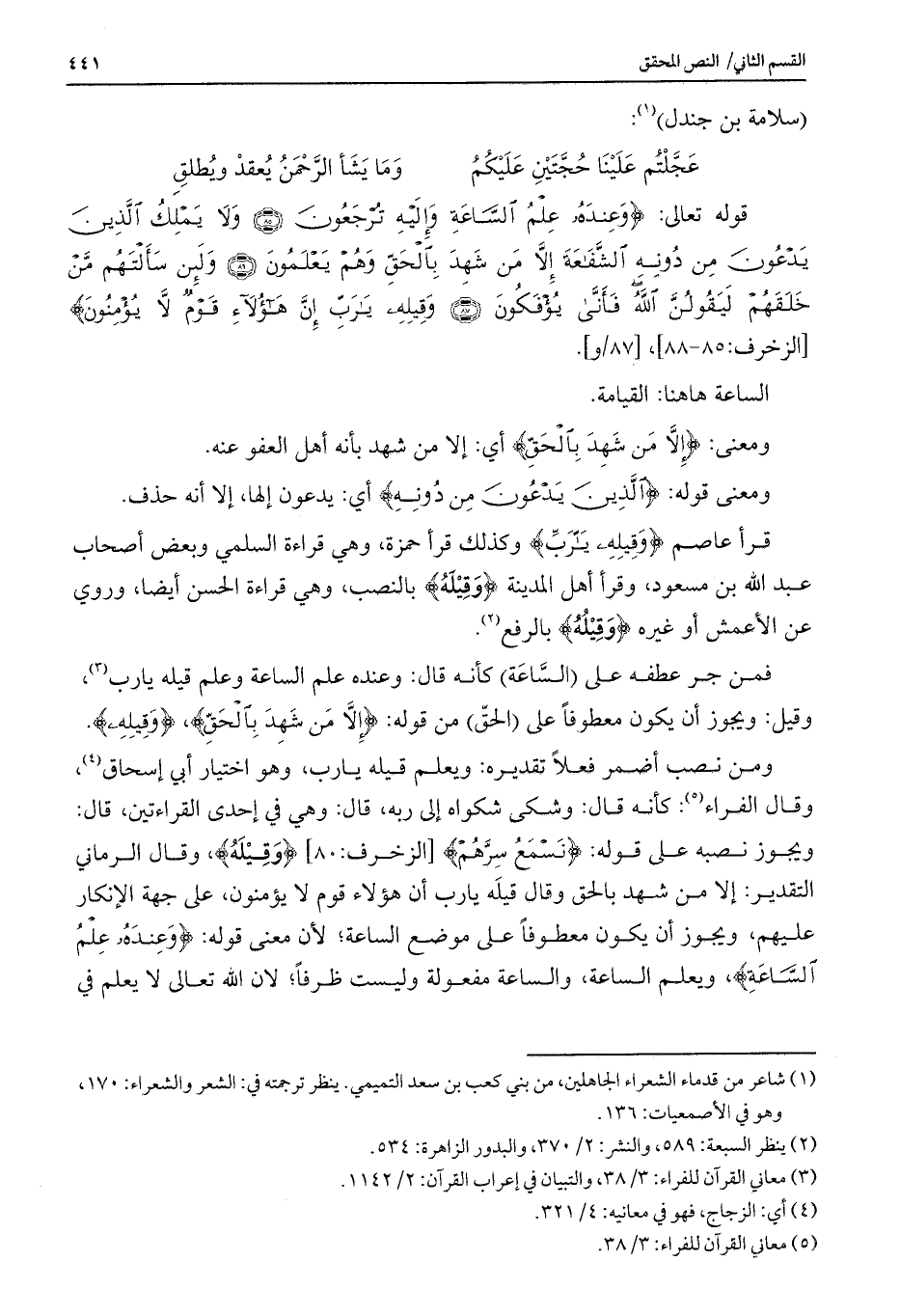 قوله تعالى: {وَعِنْدَهُ عِلْمُ السَّاعَةِ وَإِلَيْهِ تُرْجَعُونَ (85) وَلَا يَمْلِكُ الَّذِينَ يَدْعُونَ مِنْ دُونِهِ الشَّفَاعَةَ إِلَّا مَنْ شَهِدَ بِالْحَقِّ وَهُمْ يَعْلَمُونَ (86) وَلَئِنْ سَأَلْتَهُمْ مَنْ خَلَقَهُمْ لَيَقُولُنَّ اللَّهُ فَأَنَّى يُؤْفَكُونَ (87) وَقِيلِهِ يَا رَبِّ إِنَّ هَؤُلَاءِ قَوْمٌ لَا يُؤْمِنُونَ} [الزخرف: 85-88] .