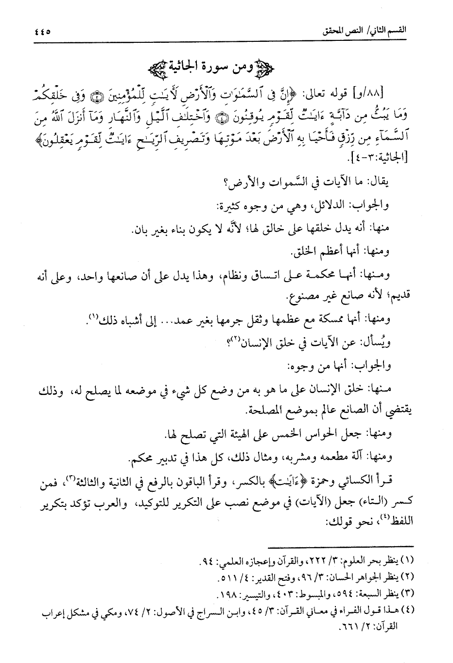قوله تعالى: {إِنَّ فِي السَّمَاوَاتِ وَالْأَرْضِ لَآيَاتٍ لِلْمُؤْمِنِينَ (3) وَفِي خَلْقِكُمْ وَمَا يَبُثُّ مِنْ دَابَّةٍ آيَاتٌ لِقَوْمٍ يُوقِنُونَ (4) وَاخْتِلَافِ اللَّيْلِ وَالنَّهَارِ وَمَا أَنْزَلَ اللَّهُ مِنَ السَّمَاءِ مِنْ رِزْقٍ فَأَحْيَا بِهِ الْأَرْضَ بَعْدَ مَوْتِهَا وَتَصْرِيفِ الرِّيَاحِ آيَاتٌ لِقَوْمٍ يَعْقِلُونَ} [الجاثية: 3-5] .
