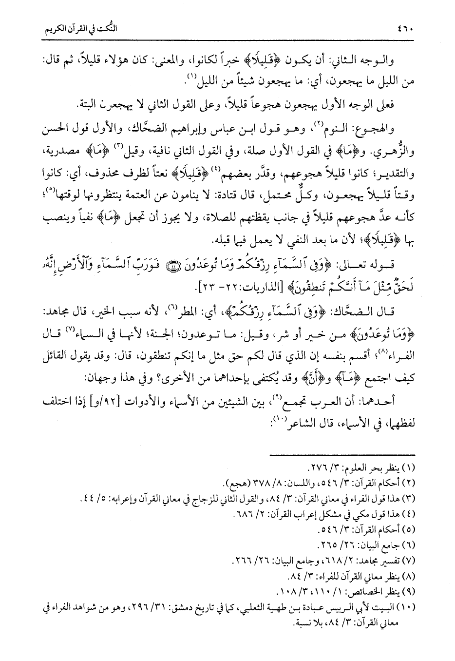 والهجوع: النوم، وهو قول ابن عباس وإبراهيم الضحاك، والأول قول الحسن والزهري. و {مَا} في القول الأول صلة، وفي القول الثاني نافية، وقيل {مَا} مصدرية، والتقدير؛ كانوا قليلاً هجوعهم، وقدر بعضهم {قَلِيلًا} نعتاً لظرف محذوف، أي: كانوا وقتاً قليلاً يهجعون، وكل محتمل، قال قتادة: لا ينامون عن العتمة ينتظرونها لوقتها؛ كأنه عد هجوعهم قليلاً في جانب يقظتهم للصلاة، ولا يجوز أن تجعل {مَا} نفياً وينصب بها {قَلِيلًا} ؛ لأن ما بعد النفي لا يعمل فيما قبله.