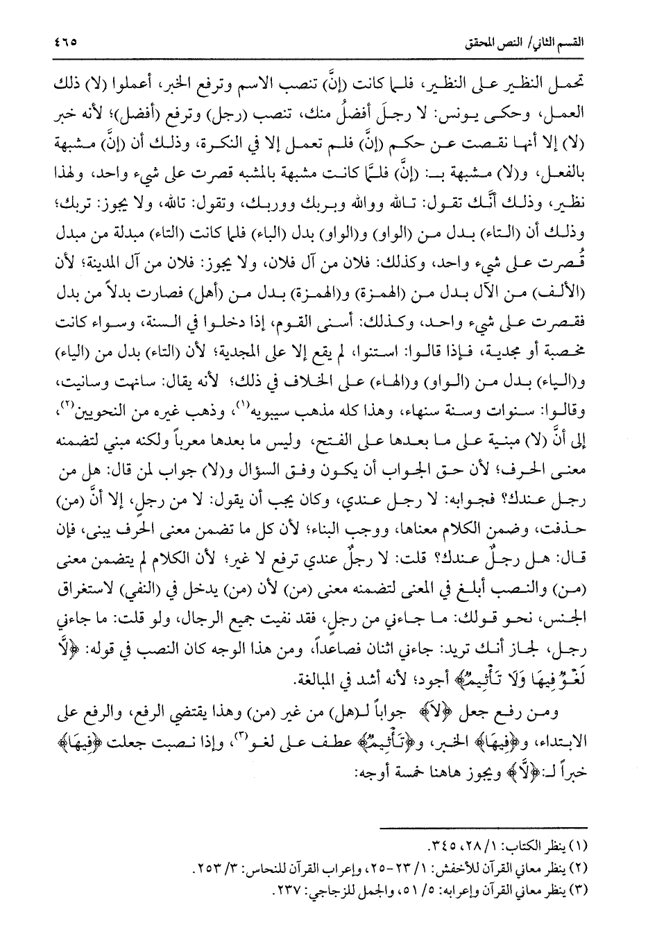 تحمل النظير على النظير، فلما كانت (إن) تنصب الاسم وترفع الخبر، أعملوا (لا) ذلك العمل، وحكى يونس: لا رجل أفضل منك، تنصب (رجل) وترفع (أفضل) ؛ لأنه خبر (لا) إلا أنها نقصت عن حكم (إن) فلم تعمل إلا في النكرة، وذلك أن (إن) مشبهة بالفعل، و (لا) مشبهة بـ: (إن) فلما كانت مشبهة بالمشبه قصرت على شيء واحد، ولهذا نظير، وذلك أنك تقول: تالله ووالله وبربك ووربك، وتقول: تالله، ولا يجوز: تربك؛ وذلك أن (التاء) بدل من (الواو) و (الواو) بدل (الباء) فلما كانت (التاء) مبدلة من مبدل قصرت على شيء واحد، وكذلك: فلان من آل فلان، ولا يجوز: فلان من آل المدينة؛ لأن (الألف) من الآل بدل من (الهمزة) و (الهمزة) بدل من (أهل) فصارت بدلاً من بدل فقصرت على شيء واحد، وكذلك: أسنى القوم، إذا دخلوا في السنة، وسواء كانت مخصبة أو مجدية، فإذا قالوا: استنوا، لم يقع إلا على المجدية؛ لأن (التاء) بدل من (الياء) و (الياء) بدل من (الواو) و (الهاء) على الخلاف في ذلك؛ لأنه يقال: سانهت وسانيت، وقالوا: سنوات وسنة سنهاء، وهذا كله مذهب سيبويه، وذهب غيره من النحويين، إلى أن (لا) مبنية على ما بعدها على الفتح، وليس ما بعدها معرباً ولكنه مبني لتضمنه معنى الحرف؛ لأن حق الجواب أن يكون وفق السؤال و (لا) جواب لمن قال: هل من رجل عندك؟ فجوابه: لا رجل عندي، وكان يجب أن يقول: لا من رجل، إلا أن (من) حذفت، وضمن الكلام معناها، ووجب البناء؛ لأن كل ما تضمن معنى الحرف يبنى، فإن قال: هل رجل عندك؟ قلت: لا رجل عندي ترفع لا غير؛ لأن الكلام لم يتضمن معنى (من) والنصب أبلغ في المعنى لتضمنه معنى (من) لأن (من) يدخل في (النفي) لاستغراق الجنس، نحو قولك: ما جاءني من رجل، فقد نفيت جميع الرجال، ولو قلت: ما جاءني رجل، لجاز أنك تريد: جاءني اثنان فصاعداً، ومن هذا الوجه كان النصب في قوله: {لَا لَغْوٌ فِيهَا وَلَا تَأْثِيمٌ} أجود؛ لأنه أشد في المبالغة.