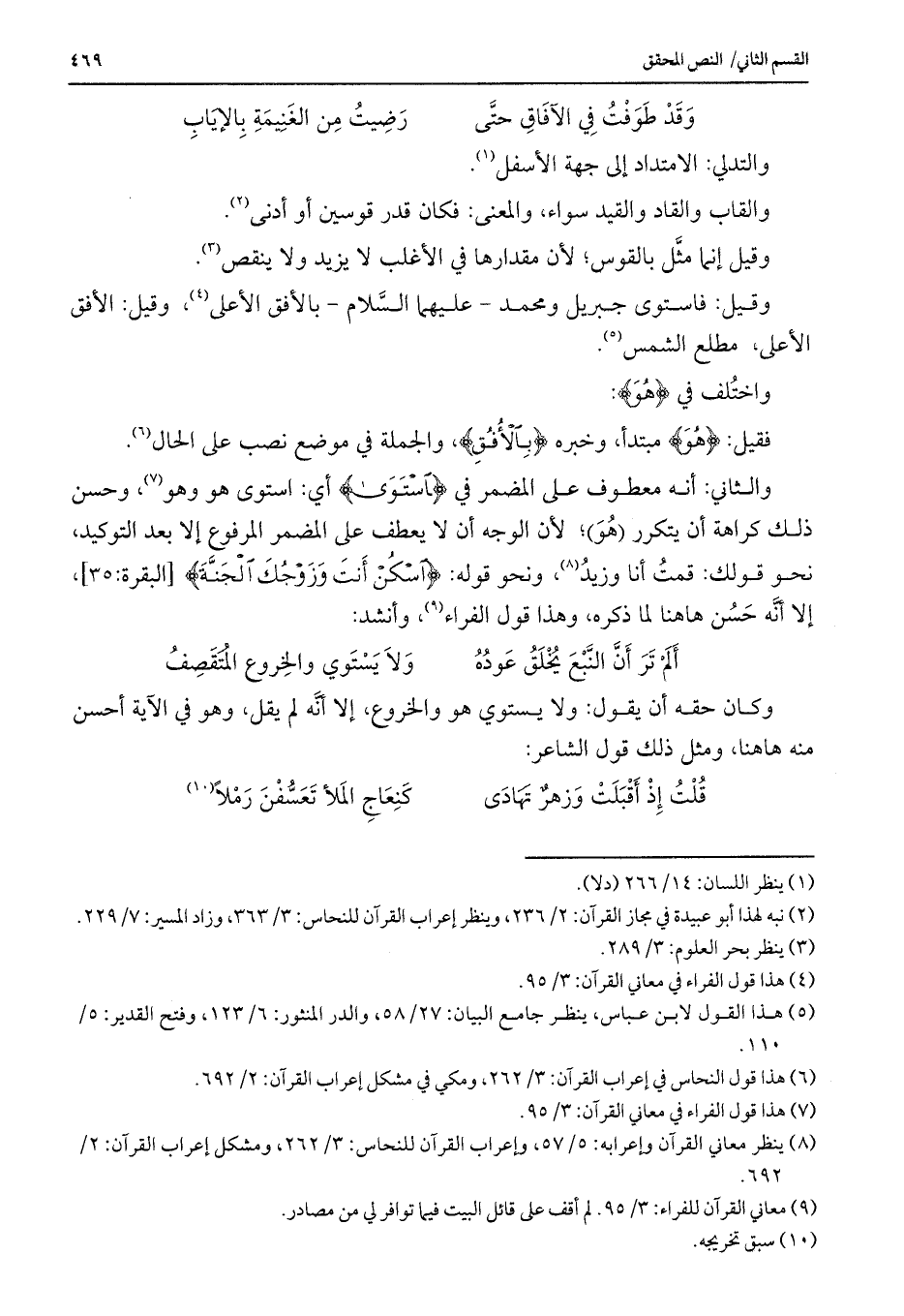والثاني: أنه معطوف على المضمر في {اسْتَوَى} أي: استوى هو وهو، وحسن ذلك كراهة أن يتكرر (هو) ؛ لأن الوجه أن لا يعطف على المضمر المرفوع إلا بعد التوكيد، نحو قولك: قمت أنا وزيد، ونحو قوله: {اسْكُنْ أَنْتَ وَزَوْجُكَ الْجَنَّةَ} [البقرة: 35] ، إلا أنه حسن هاهنا لما ذكره، وهذا قول الفراء، وأنشد: