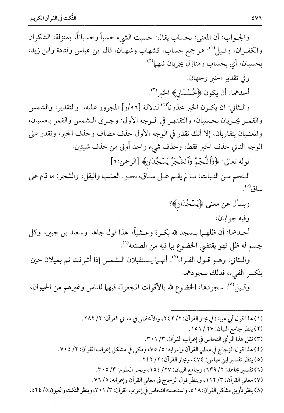 والثاني: أن يكون الخبر محذوفاً لدلالة المجرور عليه، والتقدير: والشمس والقمر يجريان بحسبان، والتقدير في الوجه الأول: وجرى الشمس والقمر بحسبان، والمعنيان يتقاربان، إلا أنك تقدر في الوجه الأول حذف مضاف وحذف الخبر، وتقدير على الوجه الثاني حذف الخبر فقط، وحذف شيء واحد أولى من حذف شيئين.