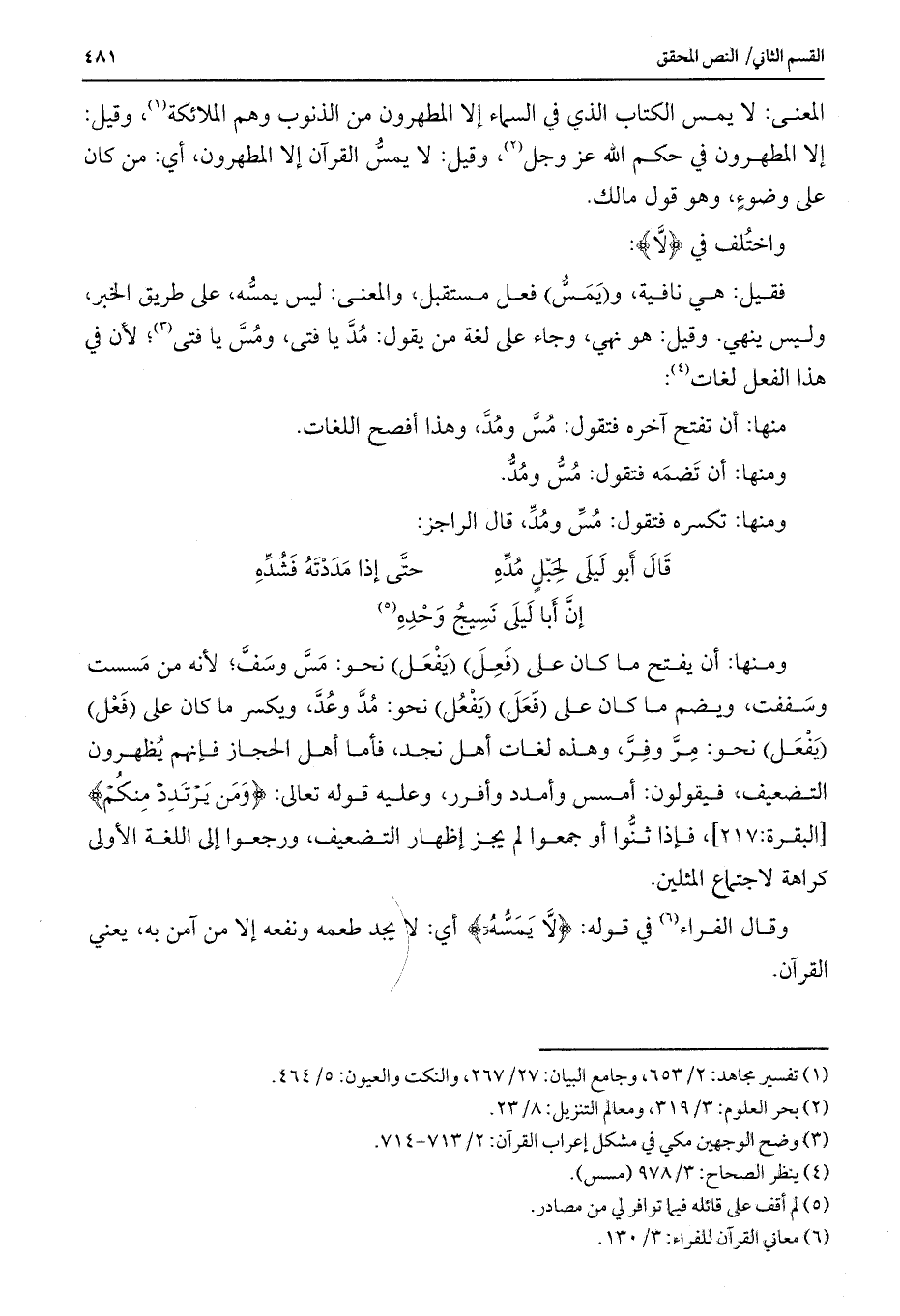 فقيل: هي نافية، و (يَمَسُّ) فعل مستقبل، والمعنى: ليس يمسه، على طريق الخبر، وليس بنهي. وقيل: هو نهي، وجاء على لغة من يقول: مد يا فتى، ومس يا فتى؛ لأن في هذا الفعل لغات: